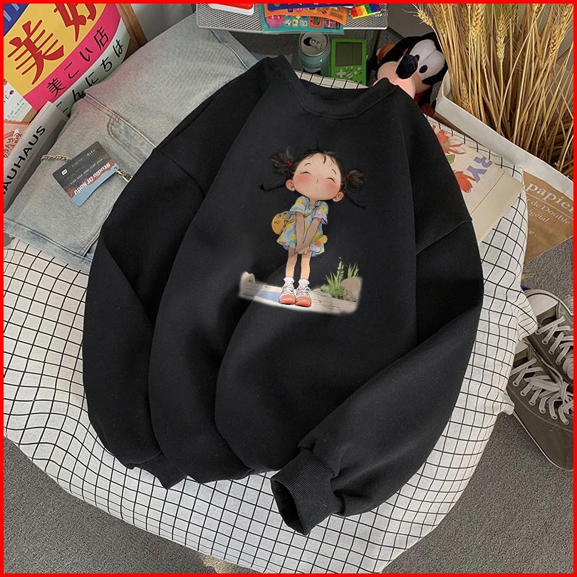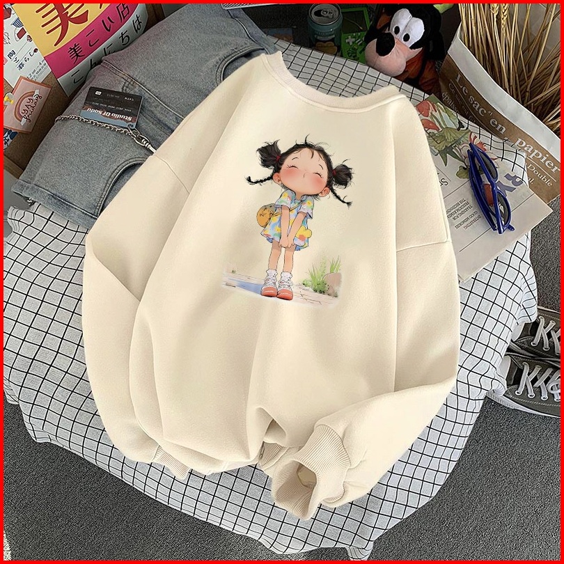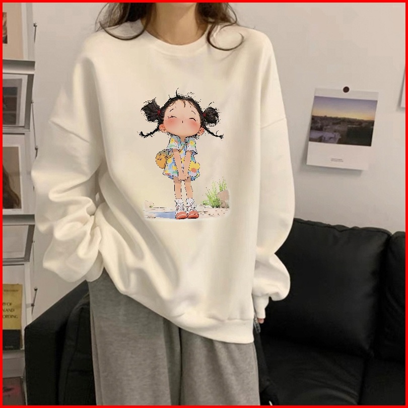 Forteid Sweater Lengan Panjang Oversized Street Style Korean Style Switer Wanita Oversize Kaos Cetakan Gadis Kartun Over