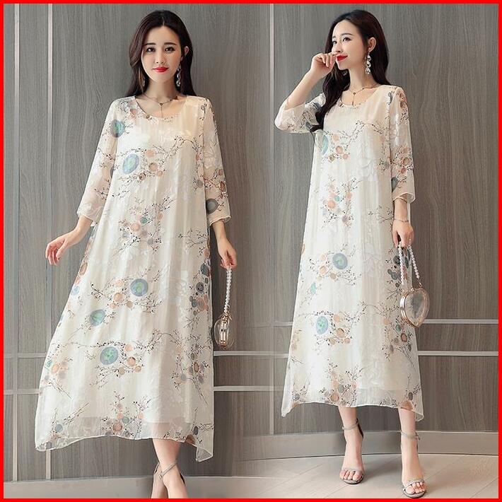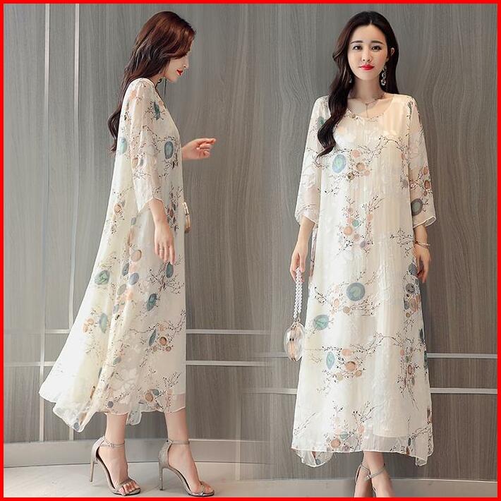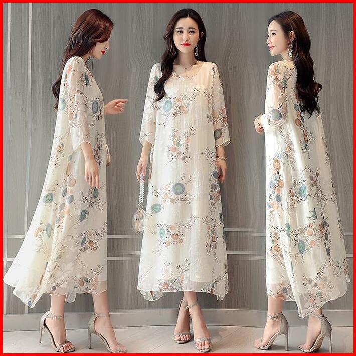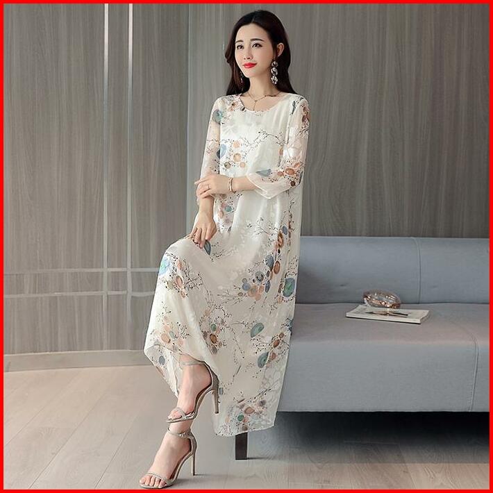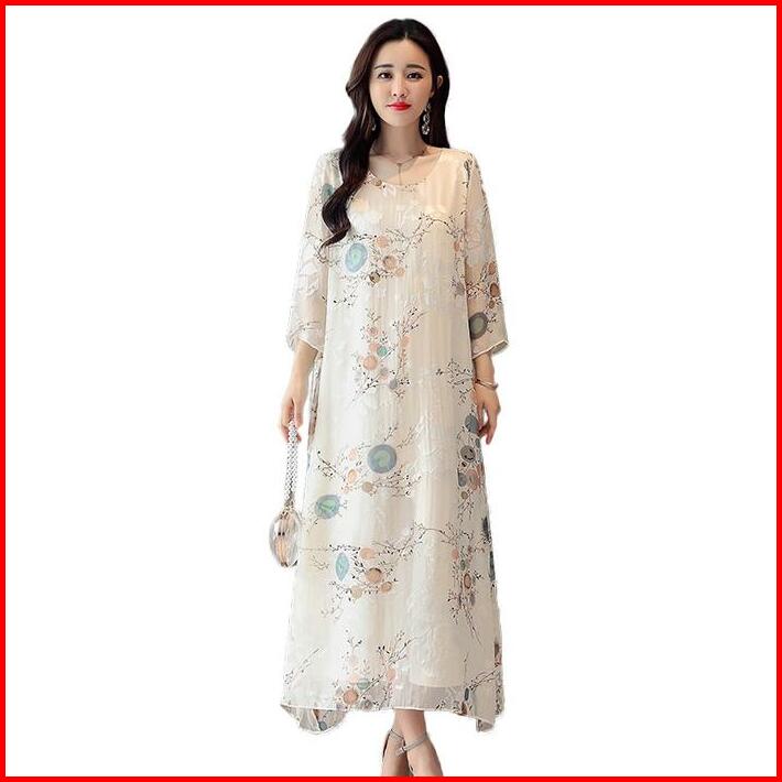 Wanita Vintage Silk Dicetak Gaun Pesta Putih