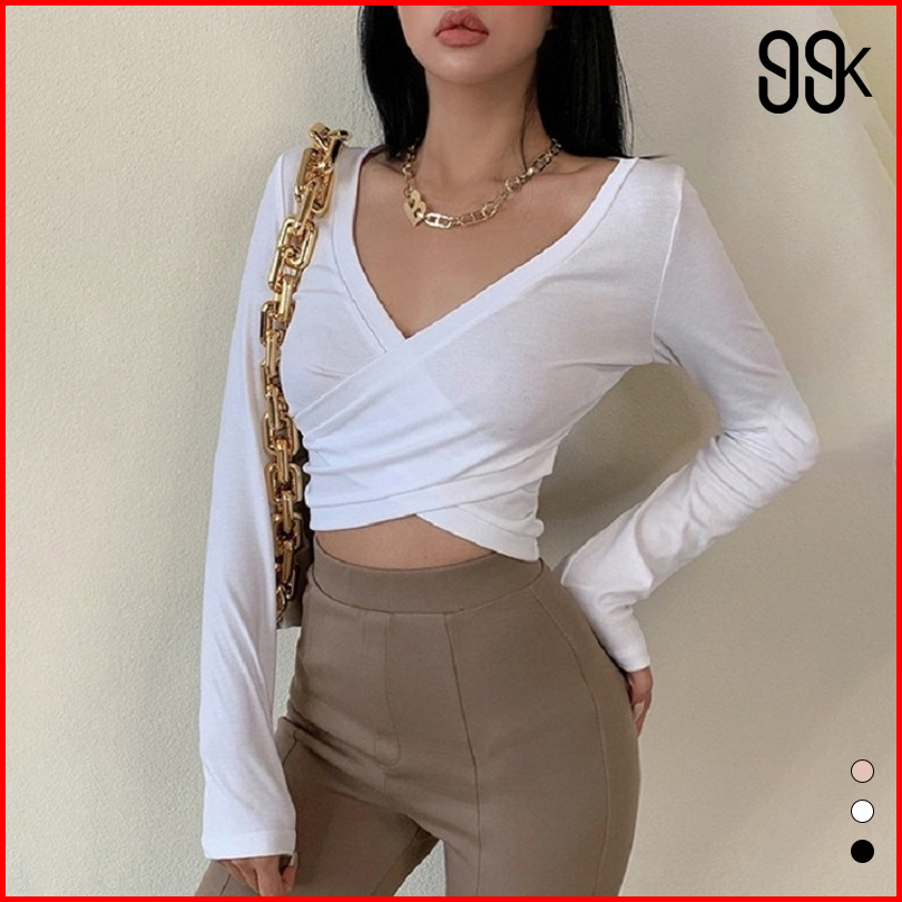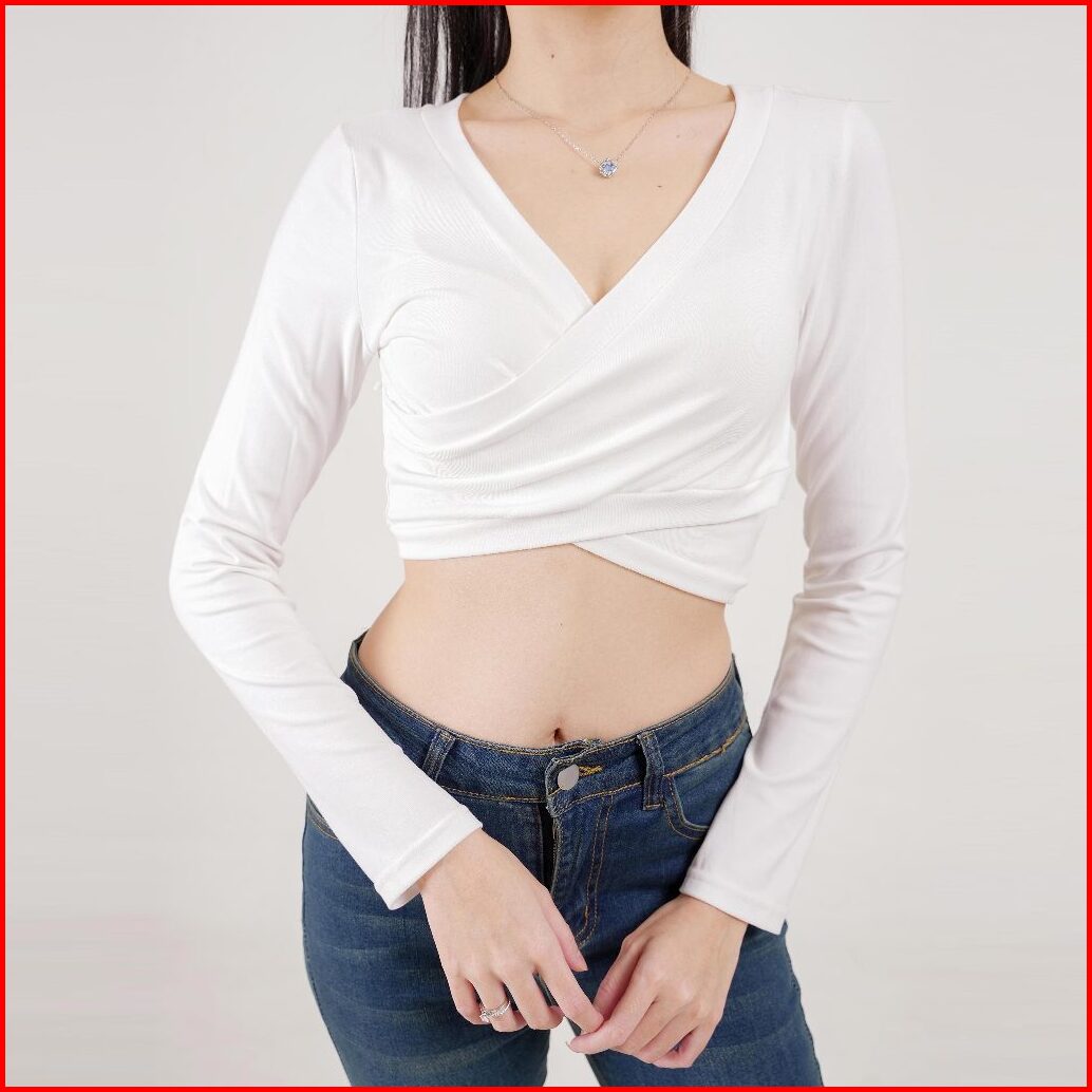 Premium99koutlet Atasan Cross Wrap Cropped V Neck Lengan Panjang 7303 S M L