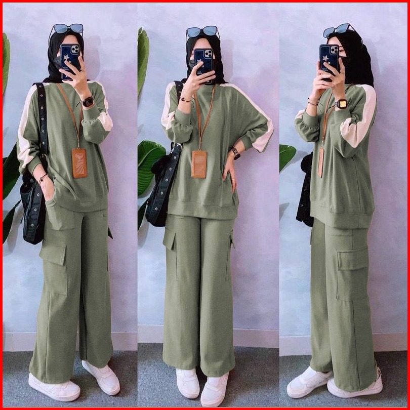 Larra One Set Sweater Celana Cargo Bahan Waffle Knit Setelan Wanita Oversize Korean Style Kekinian