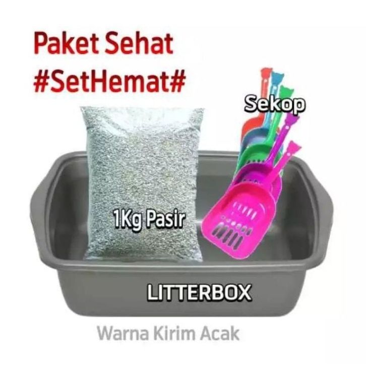 Bak Litterbox Bak Kucing + Sekop + Pasir Kucing zeolit 1kg, 1set Tempat Pup Kucing Bak Pasir Kucing
