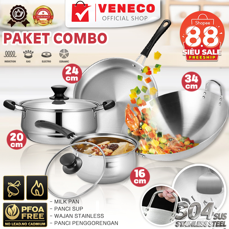 PANCI STAINLESS STEEL 4 Set Panci dan Wajan Stainless Steel / Wajan Stainless 34cm Panci Sup 22cm, Panci Mie 18cm, Wajan 26cm