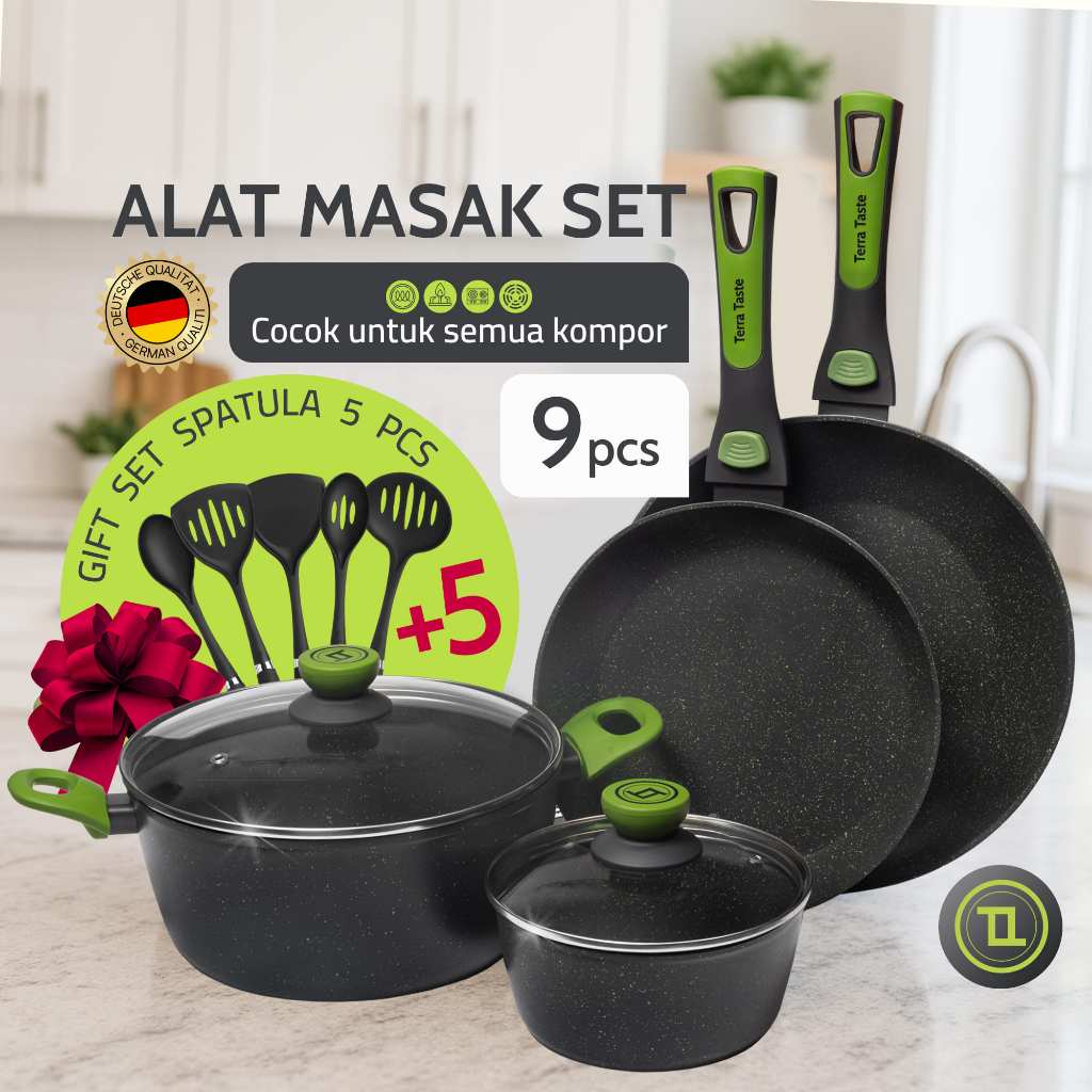 [Terra Taste] Set Panci & Wajan 9 Pcs Premium Anti Lengket Granit Aluminium Alloy Non-Stick + Tutup Kaca Ventilasi Uap & Pegangan Detachable Untuk Semua Jenis Kompor