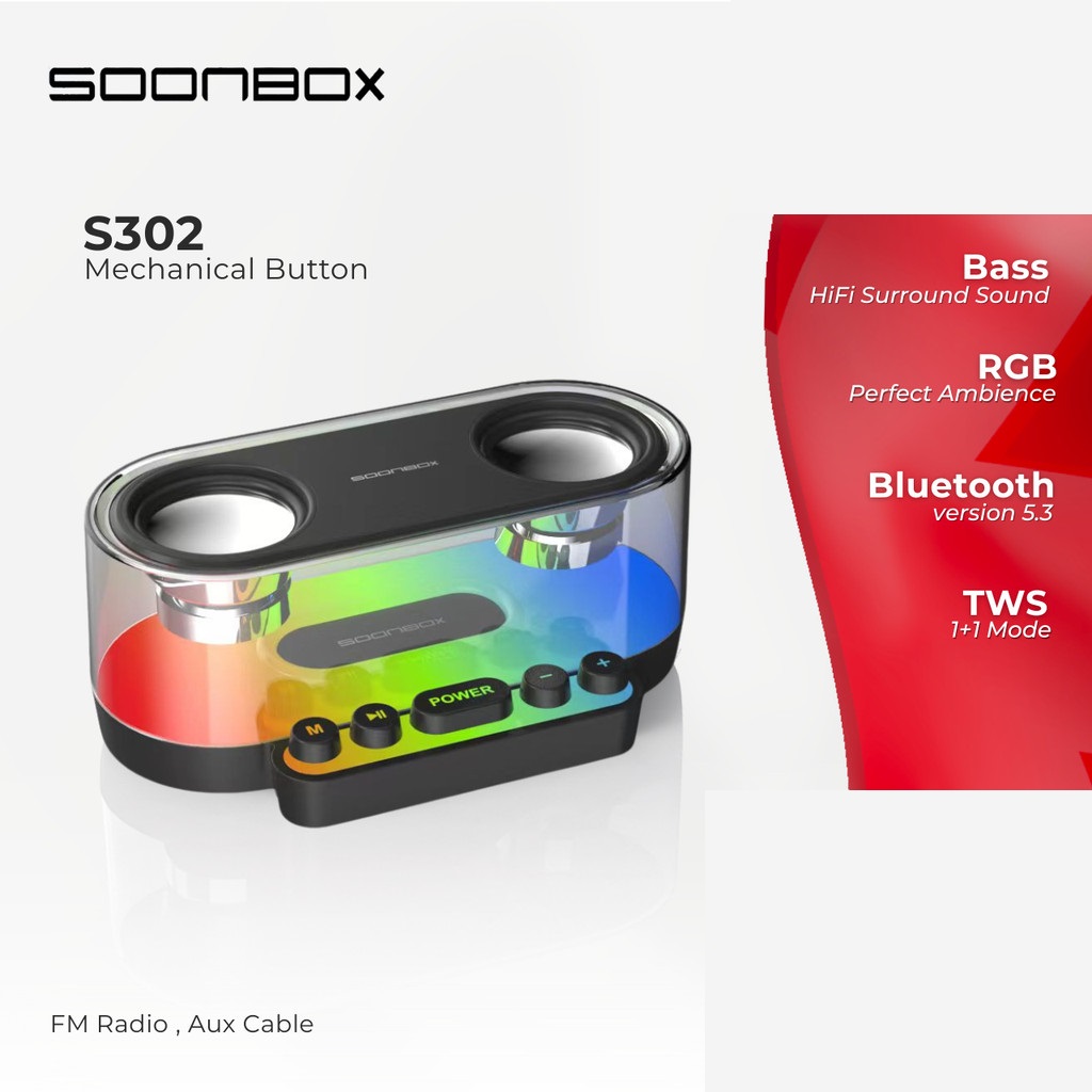 SOONBOX S302 Speaker Bluetooth 5.3 Portabel 20W Suara 360° LED Light Bass Sound + Mechanical Button
