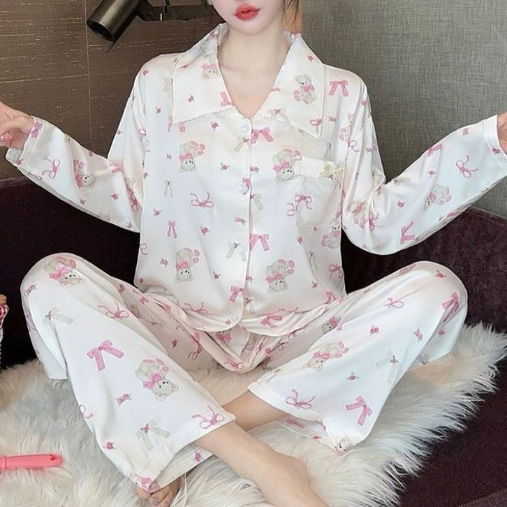 RK - READY Baju Tidur Lengan Panjang Satin Setelan Bear Coquette Oneset Wanita Baju Tidur Satin Lengan Panjang A40