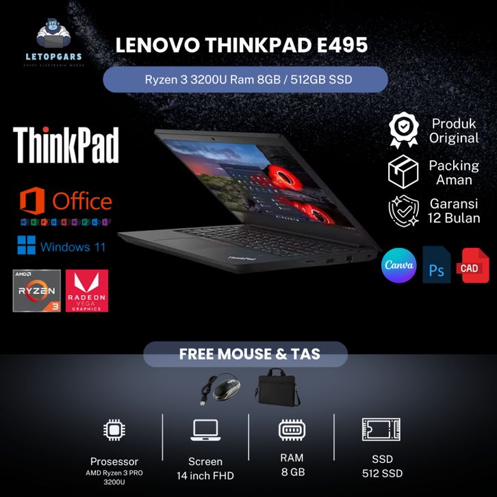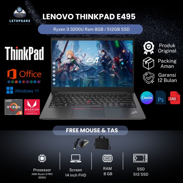 LAPTOP GAMING MURAH !! Lenovo ThinkPad E495 Laptop Ryzen 3 RAM 8GB / 512GB SSD - 16GB / 512GB SSD FREE TAS & MOUSE