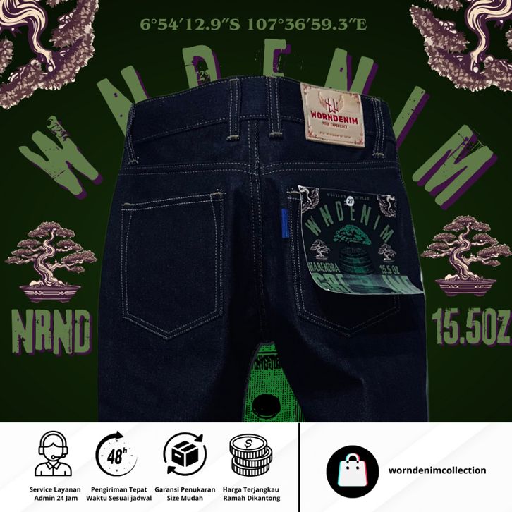TERLARIS WORNDENIM-NARENDRA-RAW DENIM 15.5OZ-UNSANFORIZED-BISA BERDIRI-KAKU TEBAL-GREENLINE SELVEDGE ACCENT