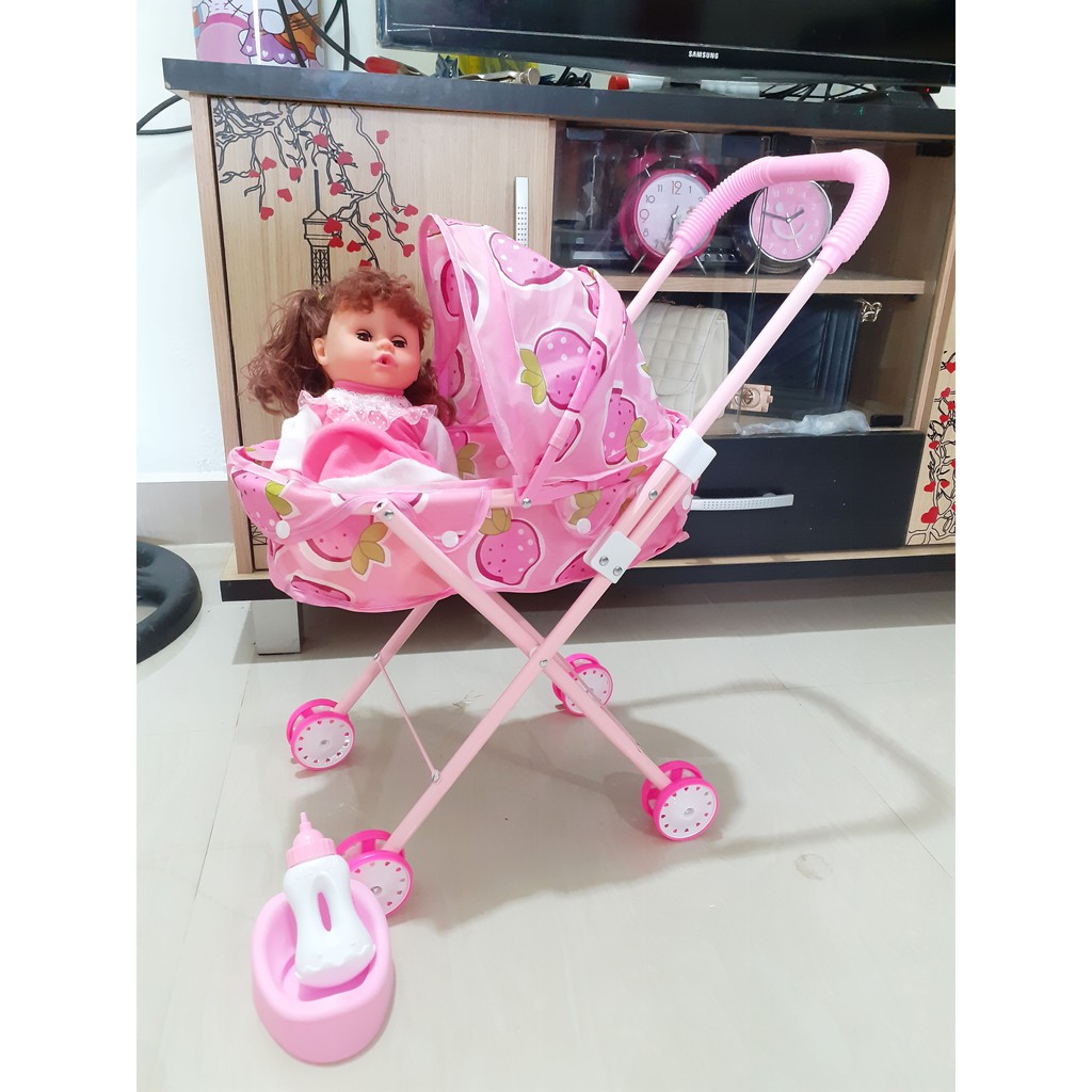 MAINAN ANAK STROLER BESI LENGKAP DENGAN BONEKA BISA BUNYI ,BISA MINUM DAN BISA PIPIS