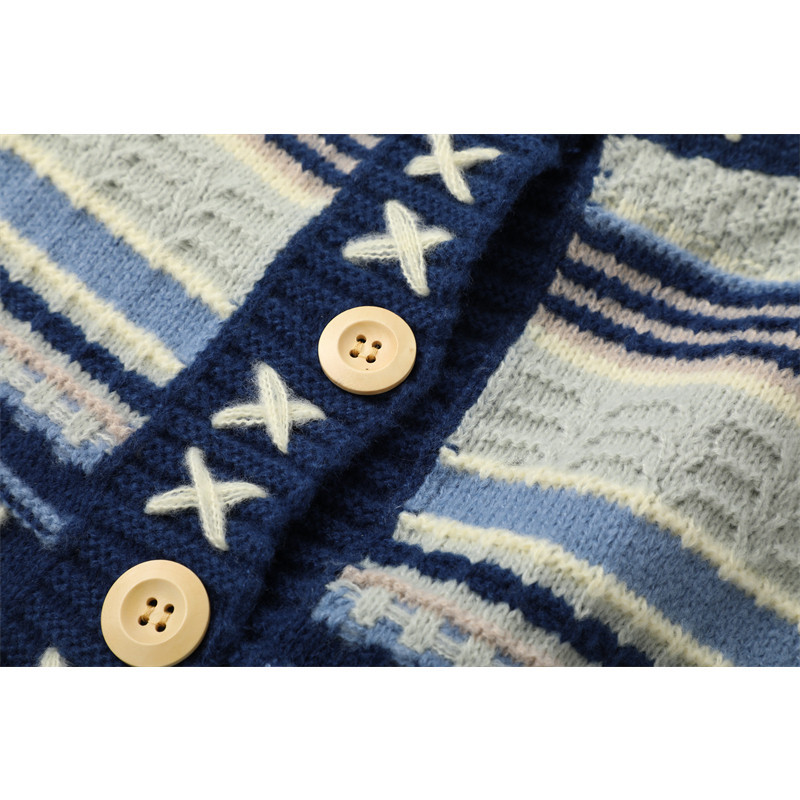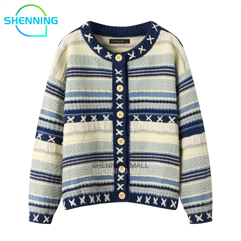 SHENNING Cardigan Rajut Premium Outer Knit Terbaru Sweater Stripe Wanita Motif Stripe Biru