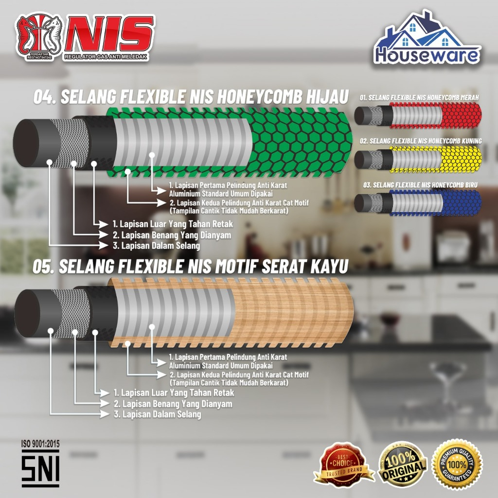 Honeycomb Kuning , Honeycomb Biru, Honeycomb Merah , Motif Serat Kayu, Selang NIS Standard , Regulator Robot Saja