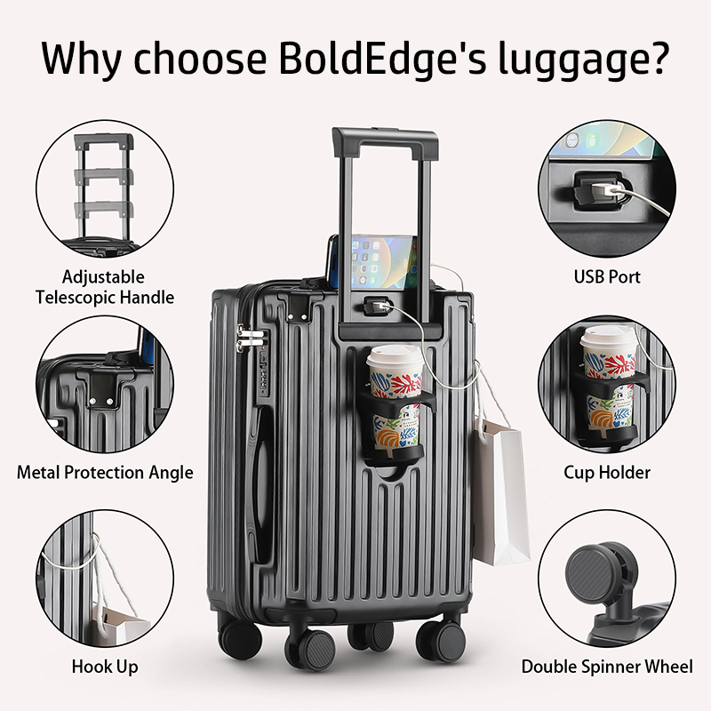 BoldEdge 20/24 Inch Koper Kabin Bagasi Desain Kait Sudut Diperkuat Tempat Gelas Port Pengisian Daya USB ABS