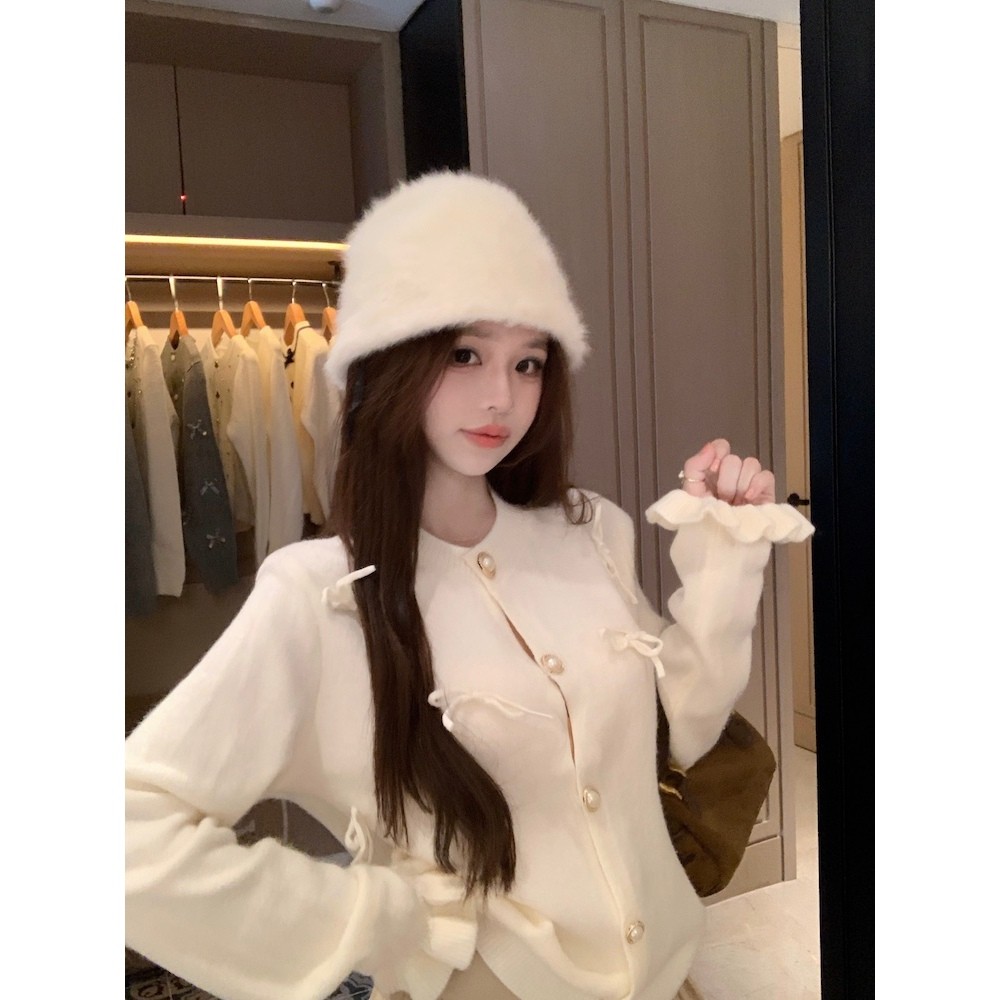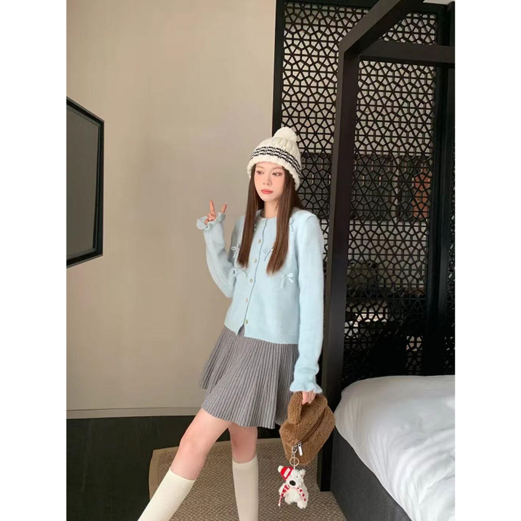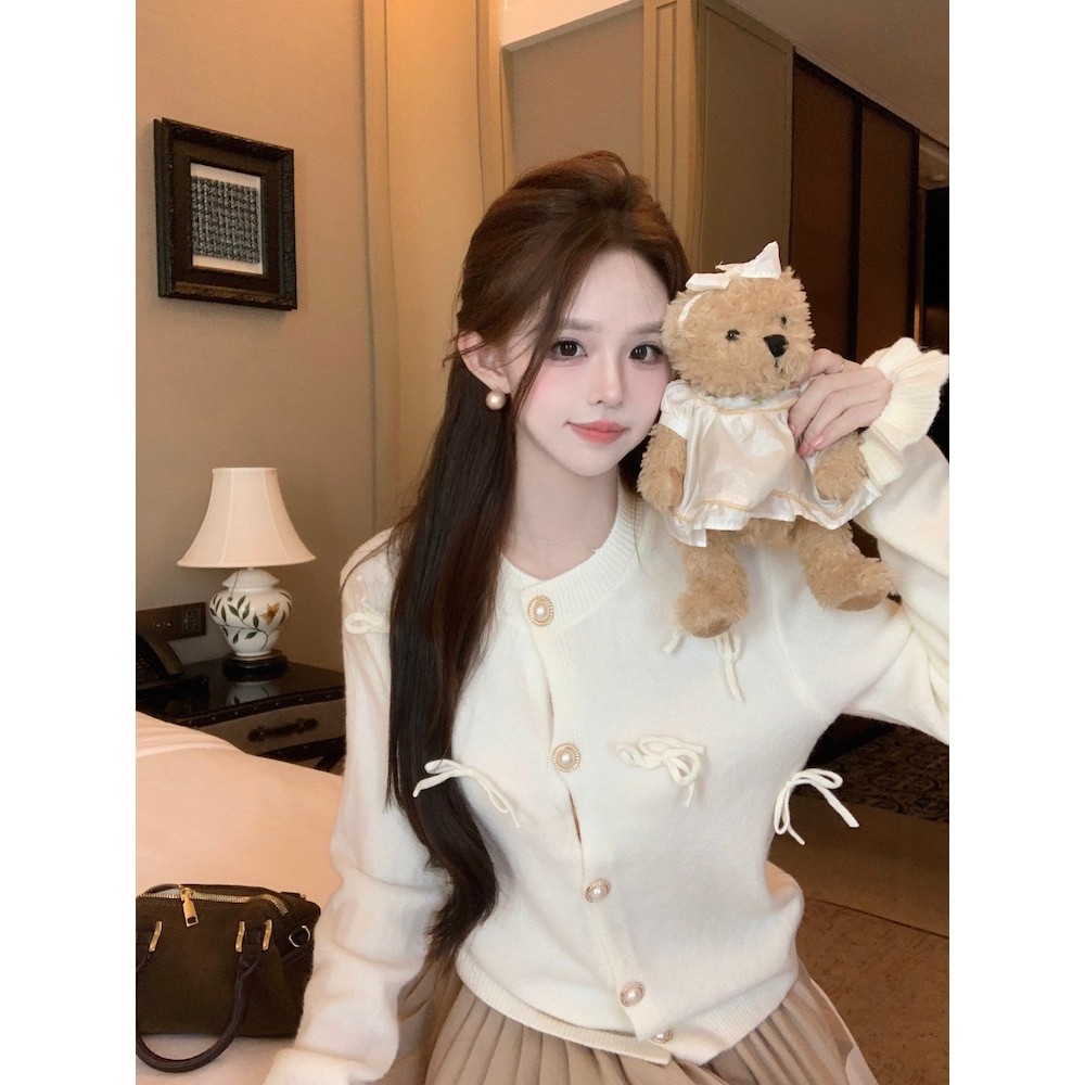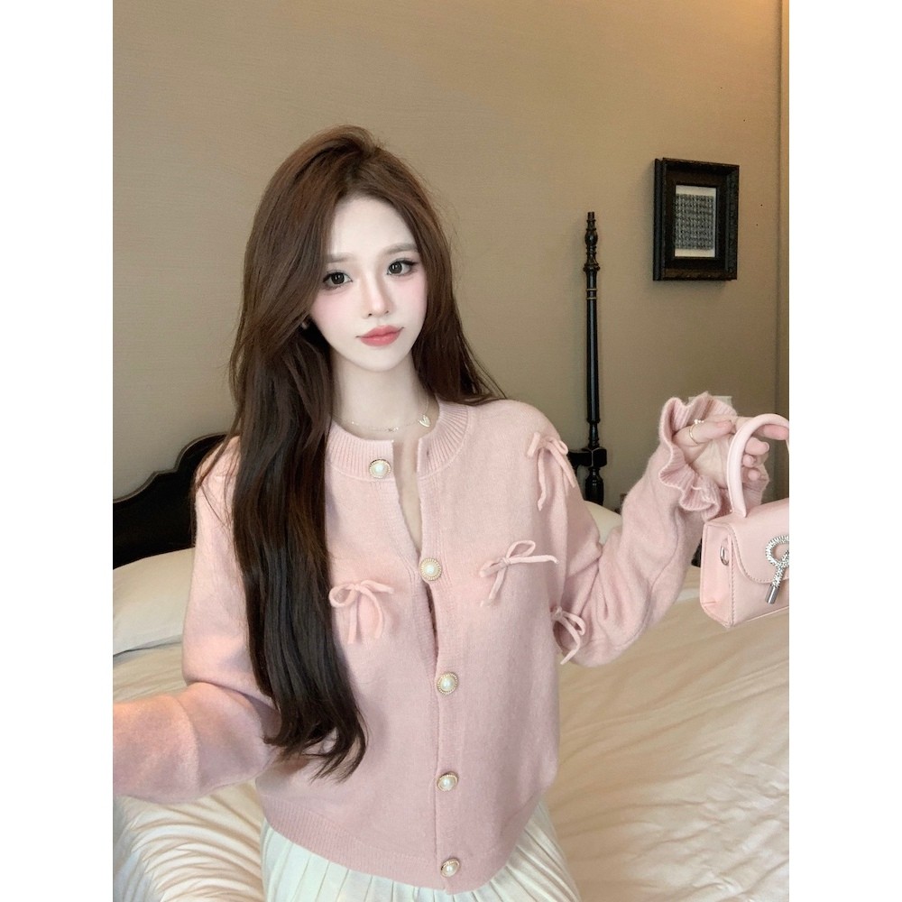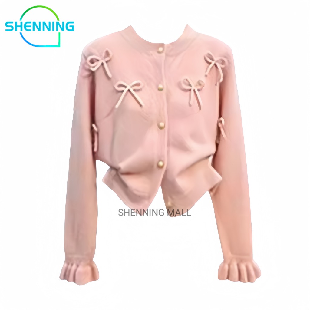 SHENNING Cardigan Pita Timbul Imut Coquette Ribbon Lembut Atasan Wanita Lengan Panjang Knitwear