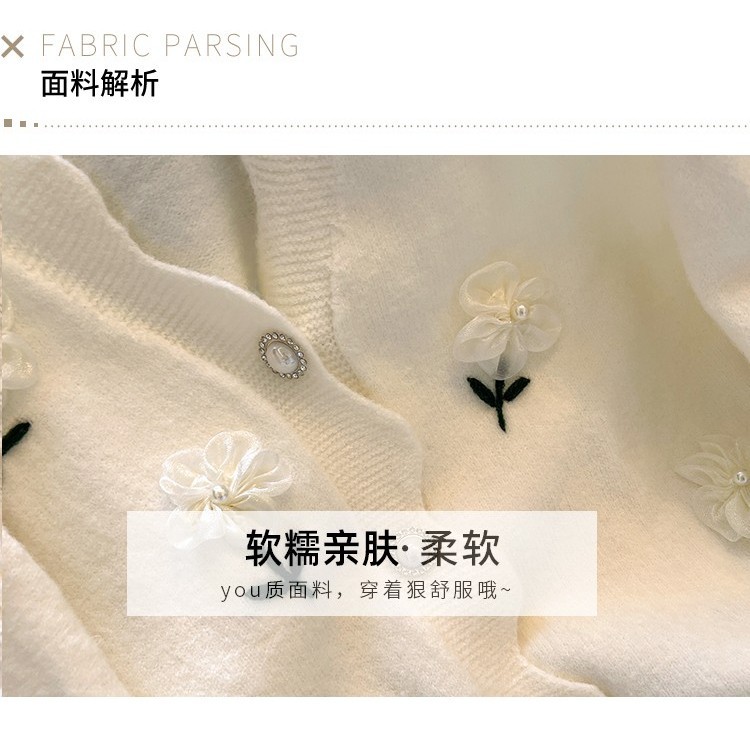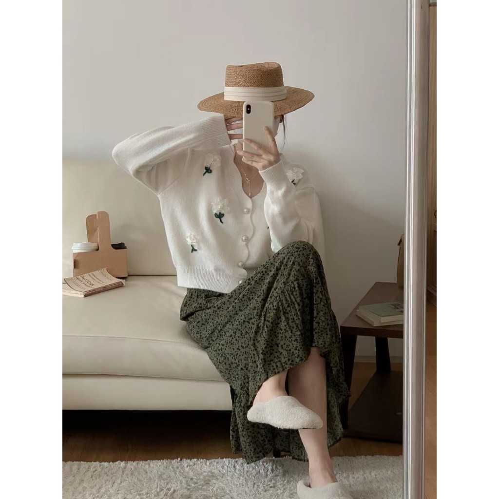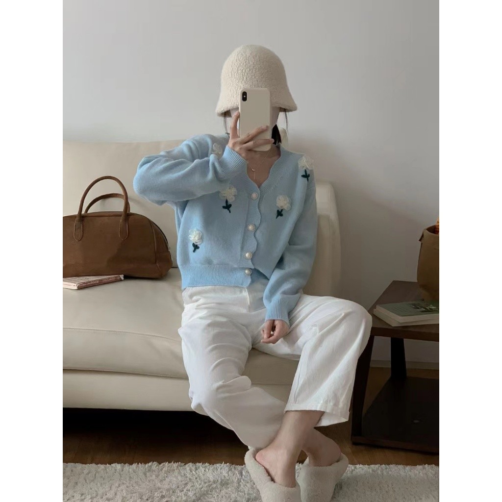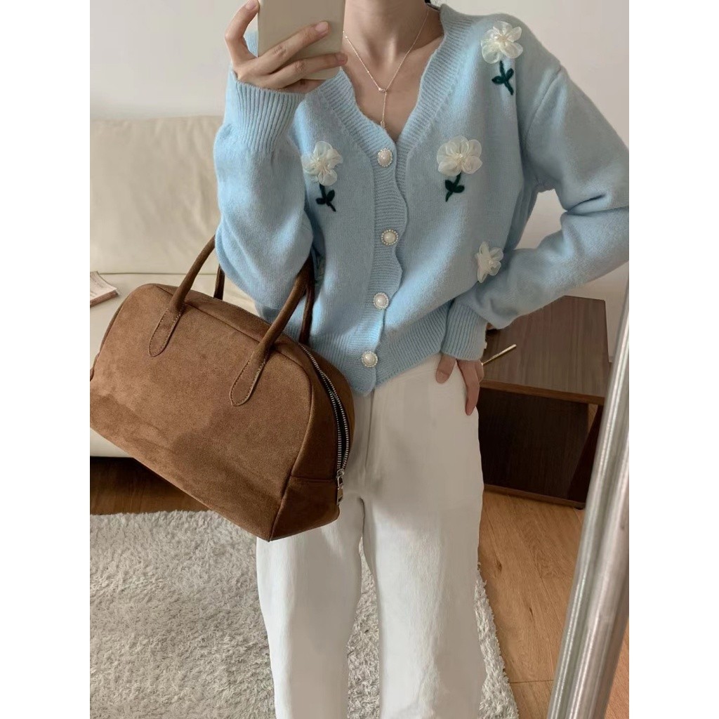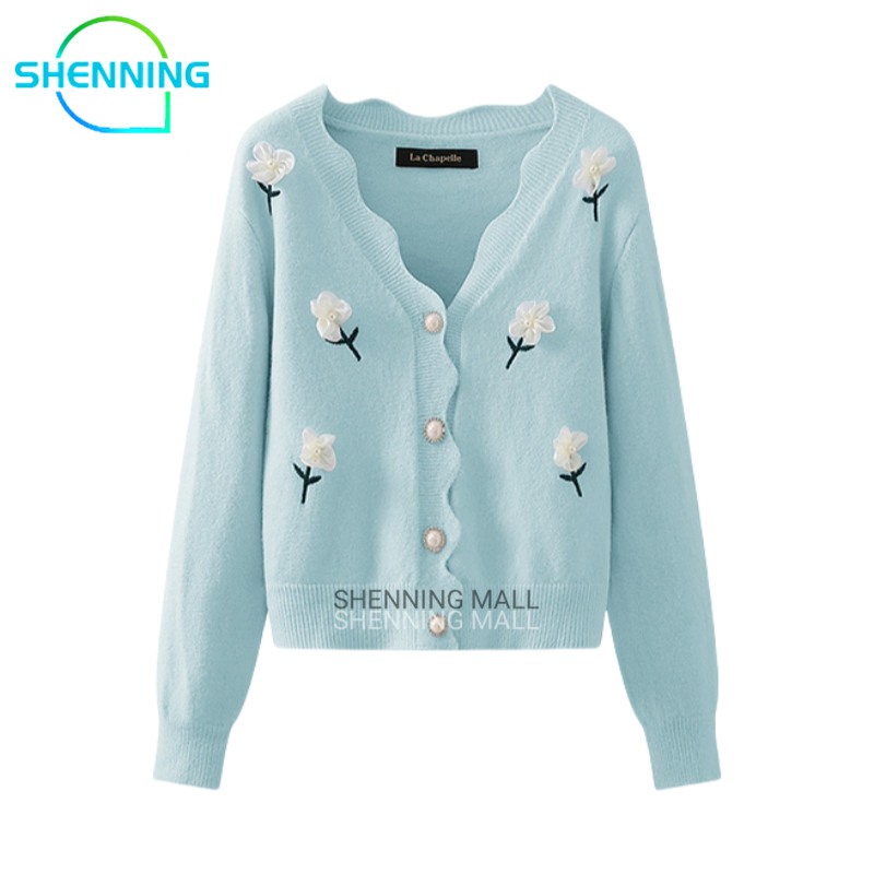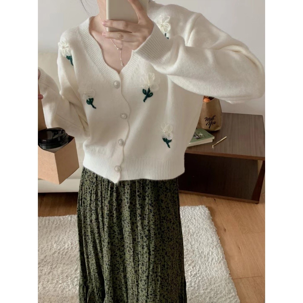 SHENNING Cardigan Wol Korean Style Rajut Tulip Putih 3D Santai Crew Neck V-Neck Polos Bunga Setrip Hitam