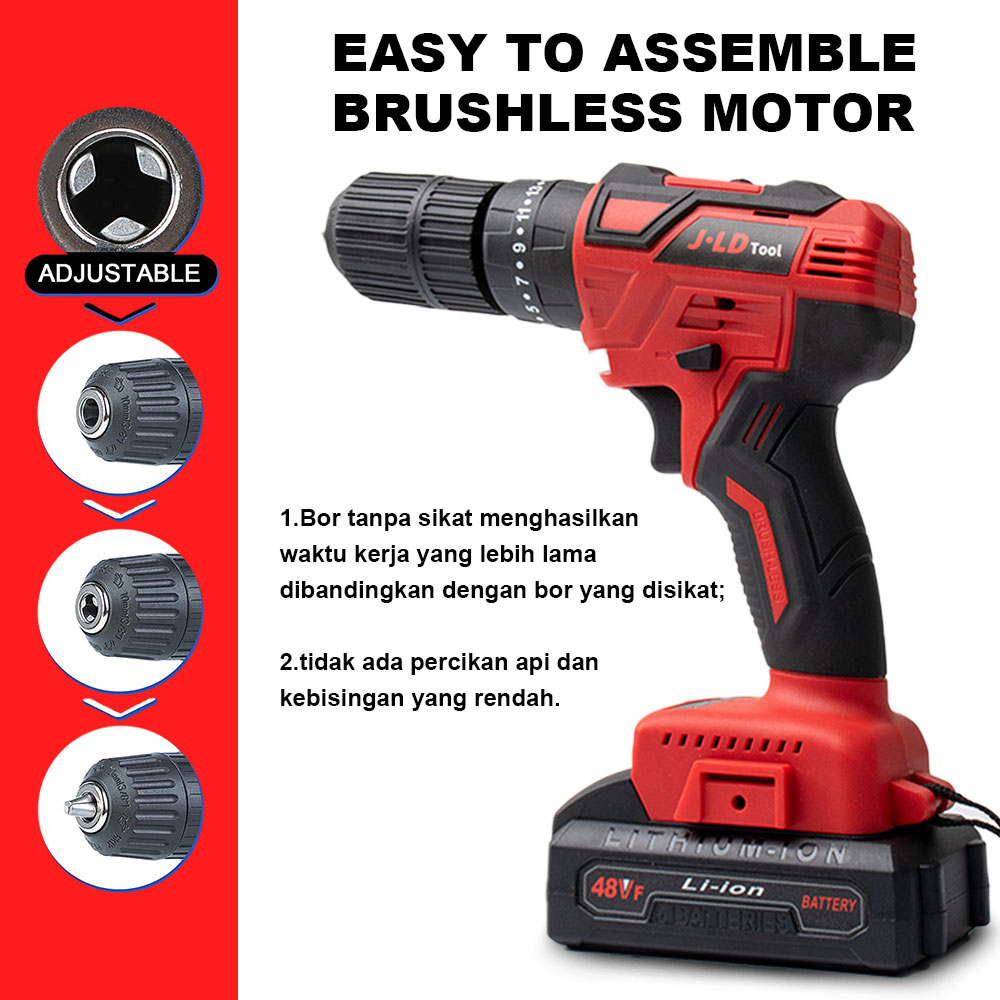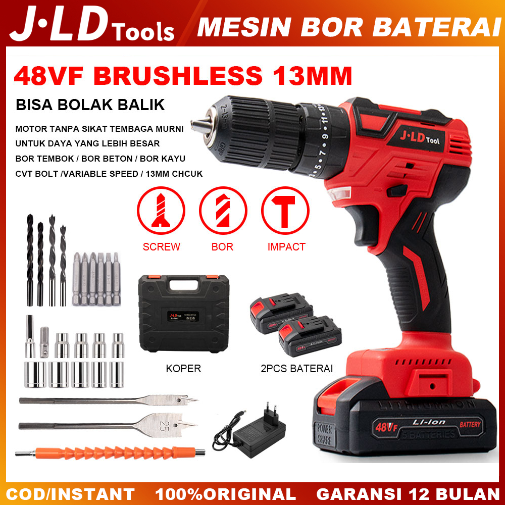 JLD Brushless Mesin bor Baterai 48VF Baterai bor cas 13MM Bor Impact Cordless Drill 2Baterai set 3Mode