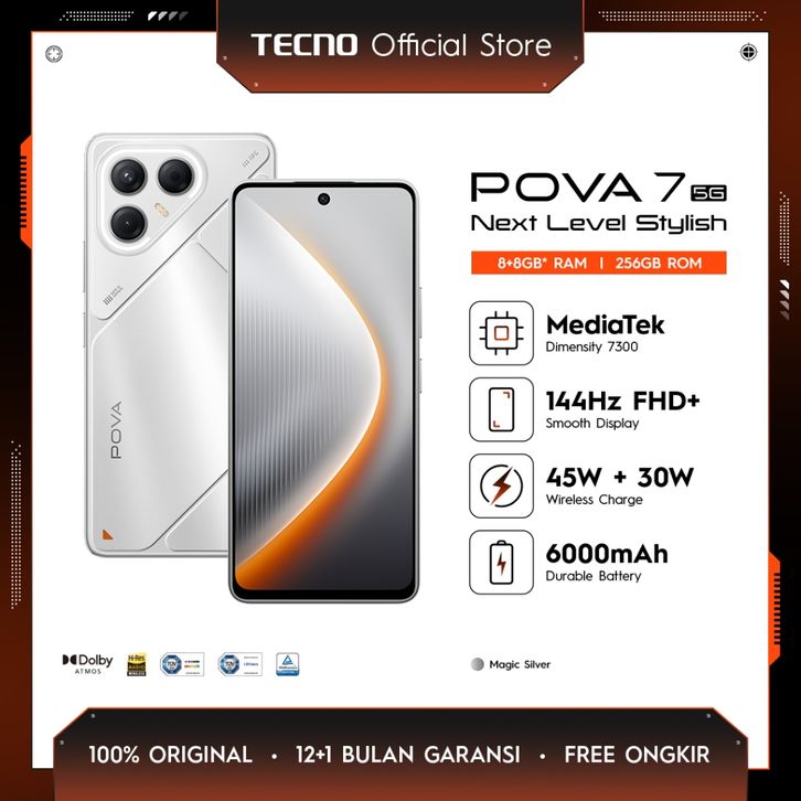 TECNO POVA 7 5G 8+8GB*/256GB, 6000 mAh, Mediatek D7300 Ultimate, 144Hz Smooth Display , 50MP Primary Camera