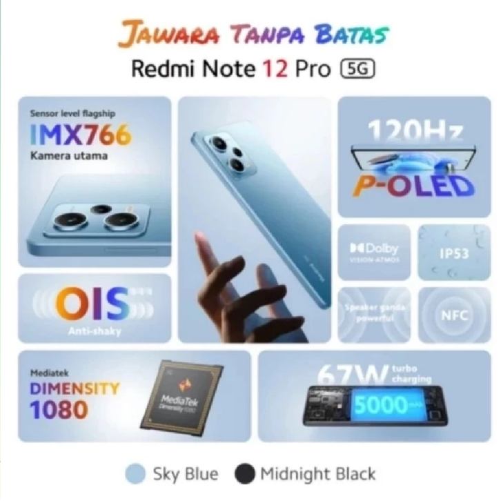 ( Tanpa DP) Xiaomi Redmi Note 12 Pro 5G 8/256GB | NFC | Kamera 50MP OIS | MediaTek Dimensity 1080 | 6.67" Layar AMOLED