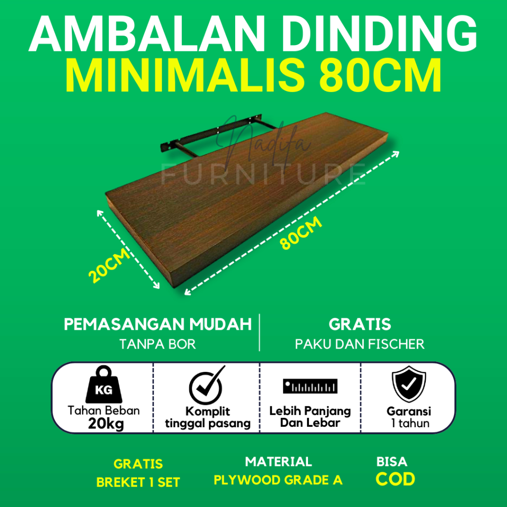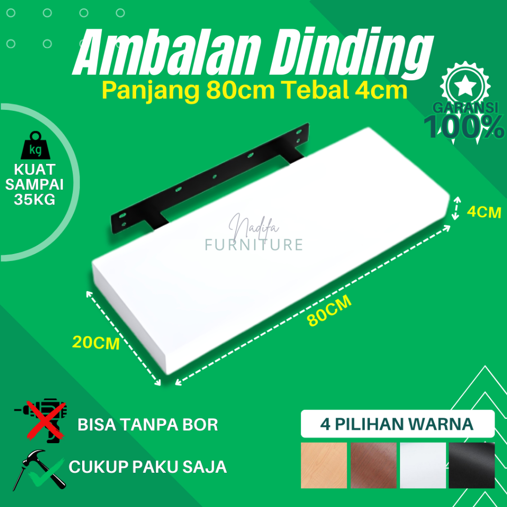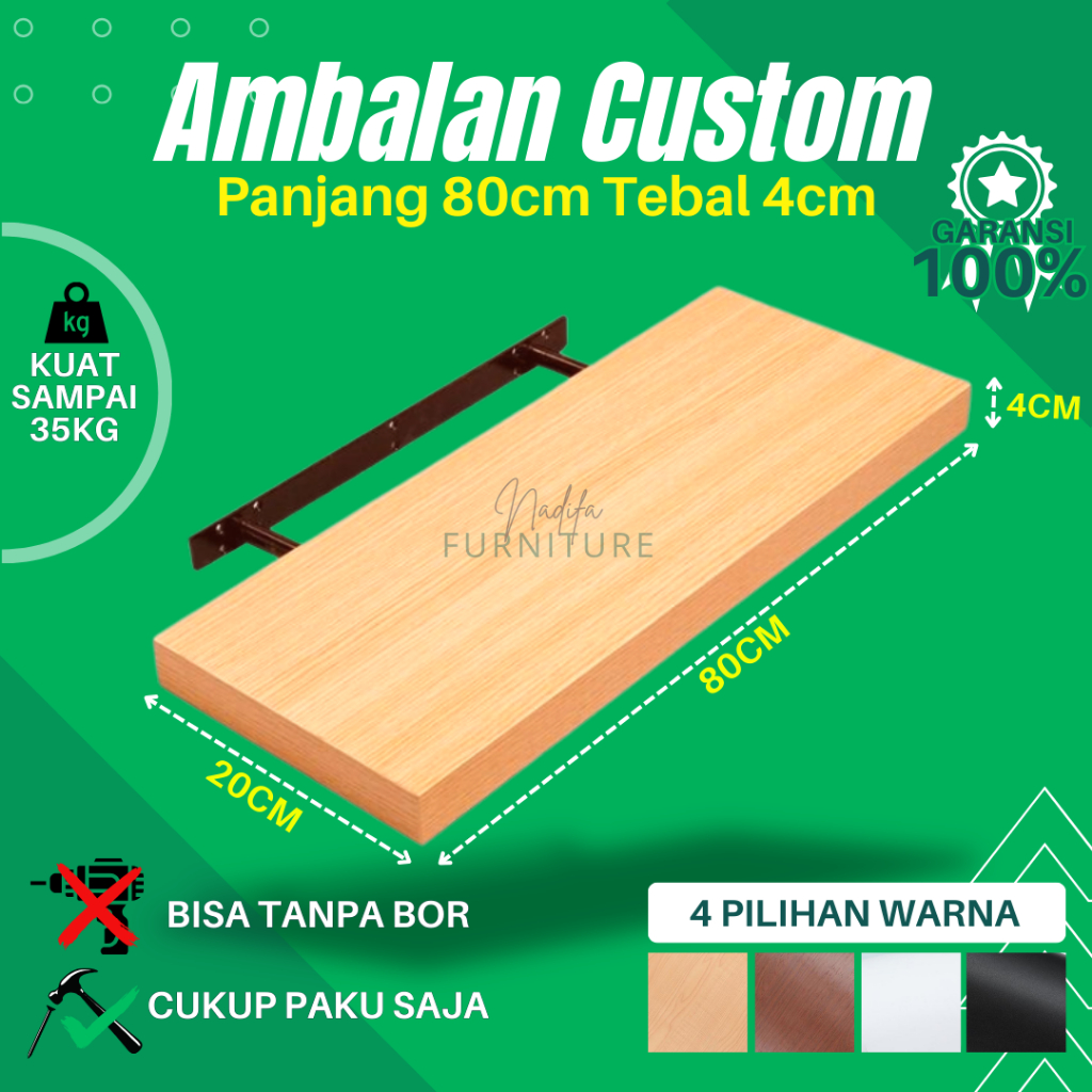 RAK AMBALAN DINDING MINIMALIS UKURAN 80CM X 20CM TEBAL 4 CM BUKU KAYU KAMAR MANDI DAPUR SERBAGUNA