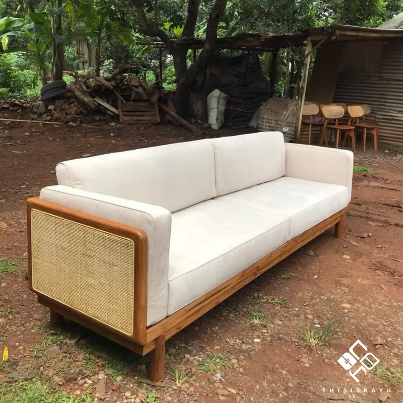 SOFA TAMU KAYU JATI ASLI MIX ANYAMAN ROTAN KEKINIAN GAYA JAPANDI JAPANESE STYLE SOFA KAYU JATI KEKINIAN GAYA SCANDINAVIAN