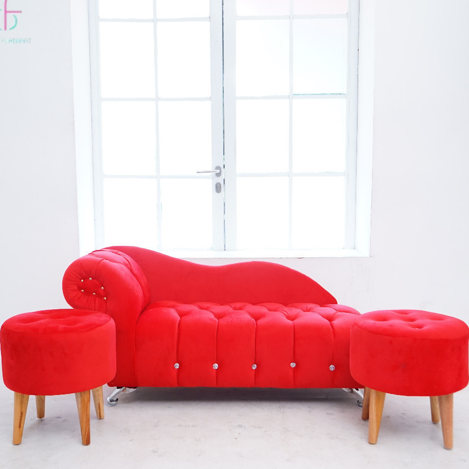 SET SOFA CHAISE LOUNGE MERAH + 2 BANGKU BULAT – SOFA MEWAH BELUDRU
