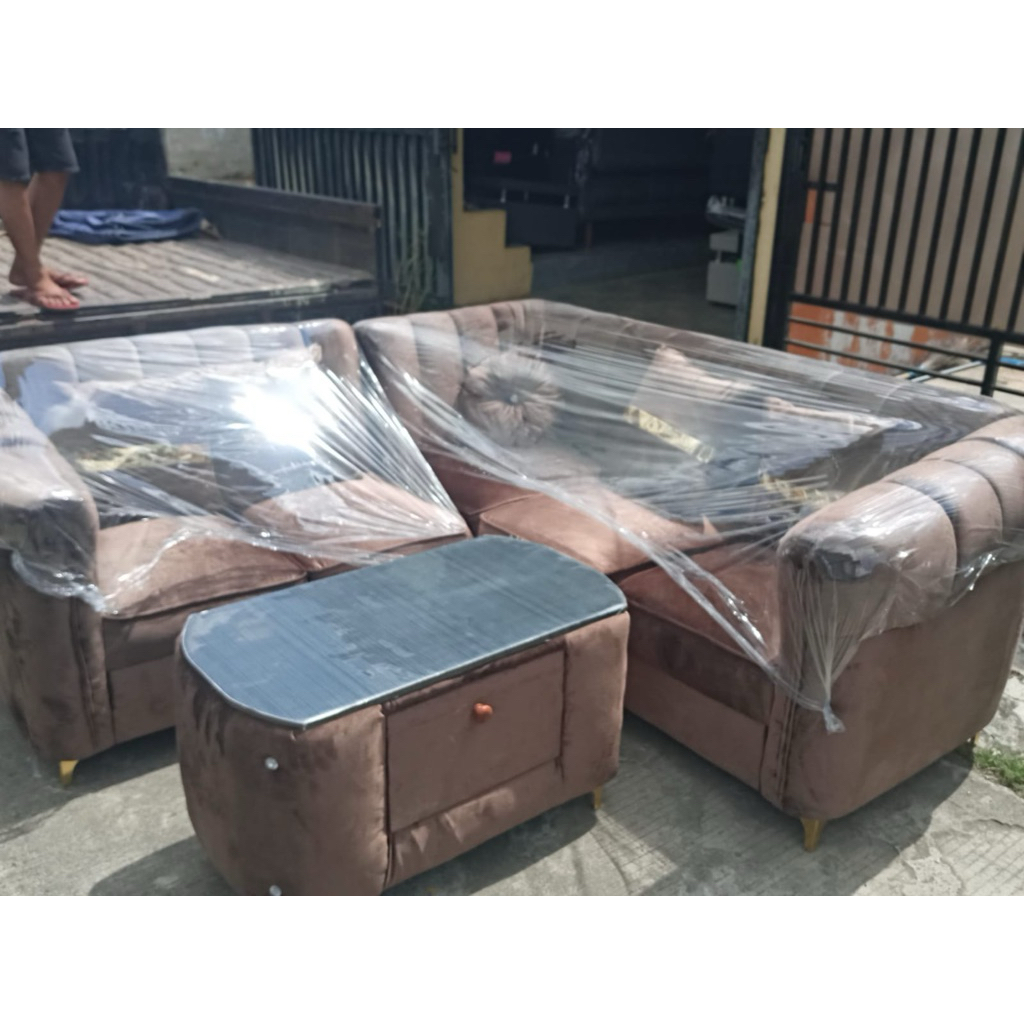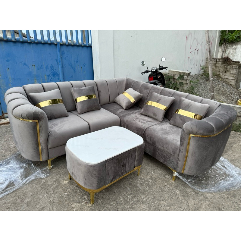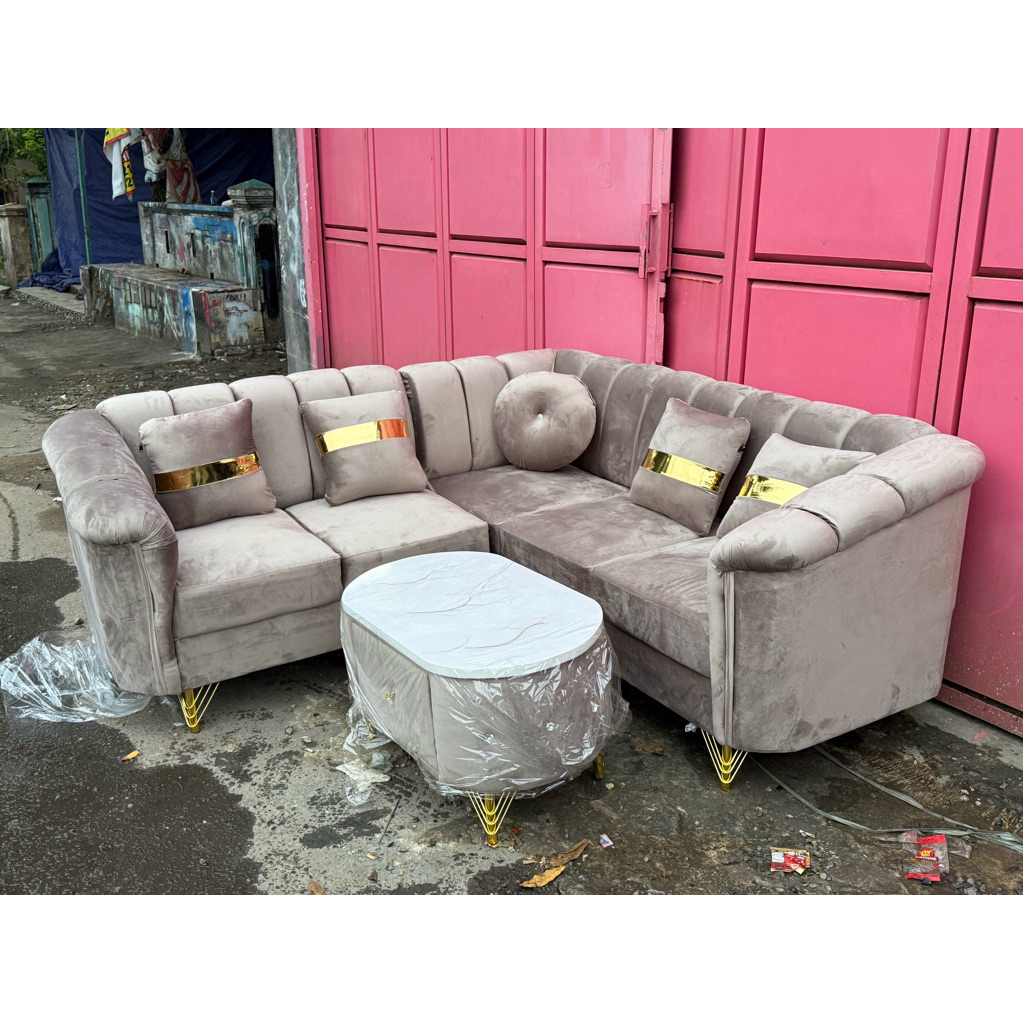 SOFA RUANG TAMU L DRUM KAKI BESI SUDUT PISAH + MEJA OVAL BAHAN FOXY FULL BUSA