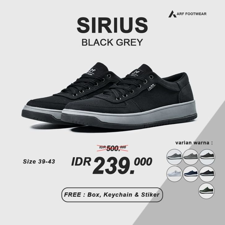 ARF Sirius Black Grey Sepatu Sneakers Casual Pria Wanita Distro Kasual Hitam Abu Abu Canvas Shoes
