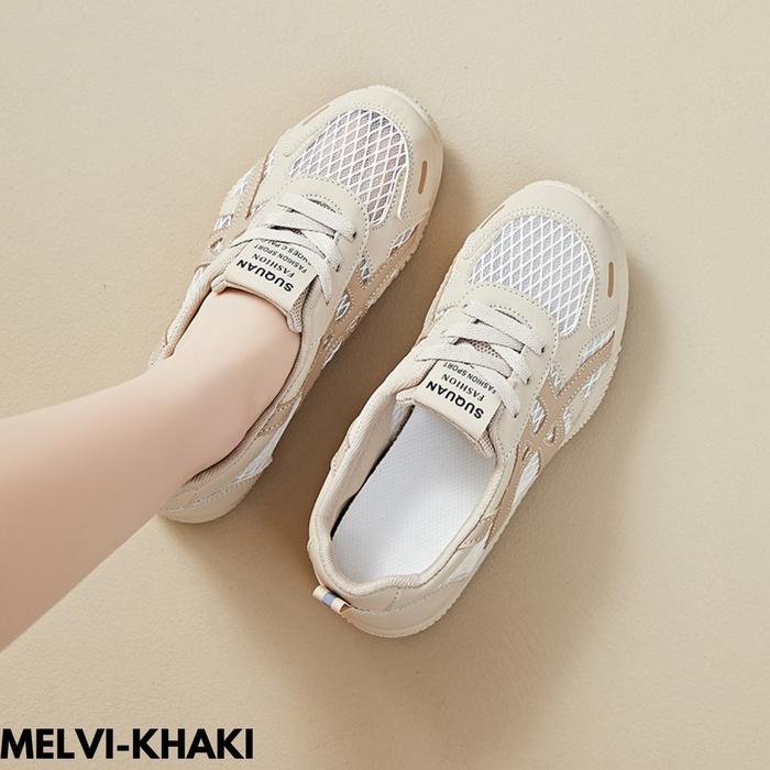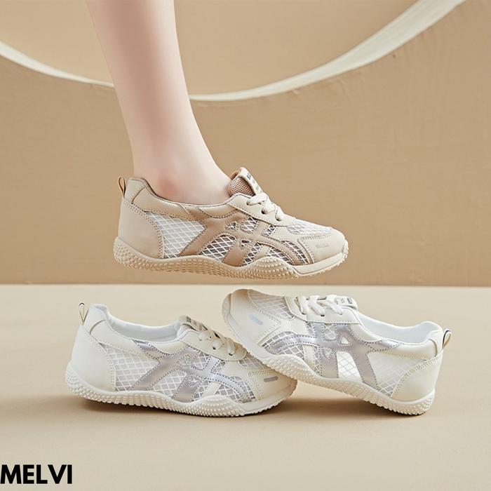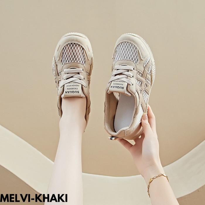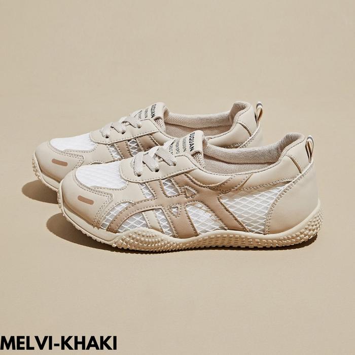 FINDME 36-40 Melvi Sepatu Sneakers Wanita Tampilan Modern Warna Pastel Gaya Casual Simple Bahan Pu Kombi Mesh - Beige 36