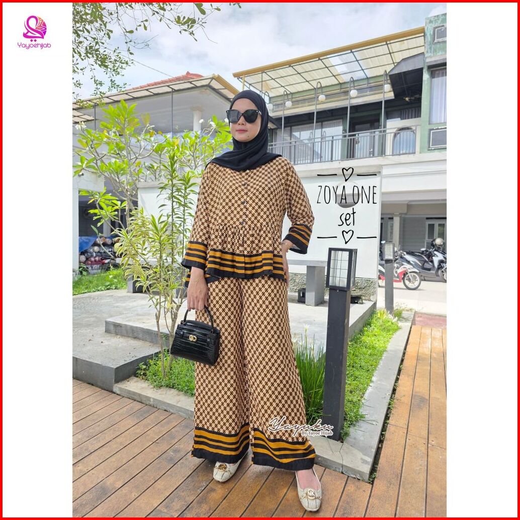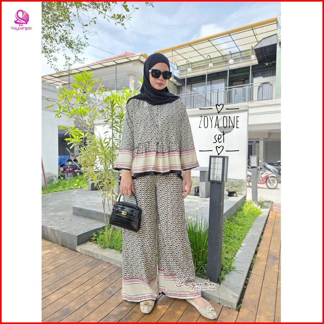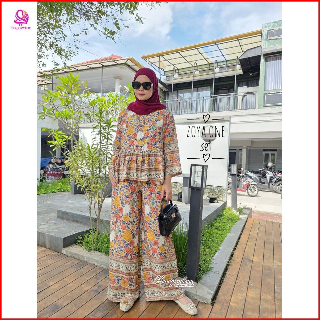 Zoya Setelan Celana Kulot Panjang Lengan 7 8 Katun Motif Premium Baju Dewasa Wanita Adem Busui Friendly Yayuku