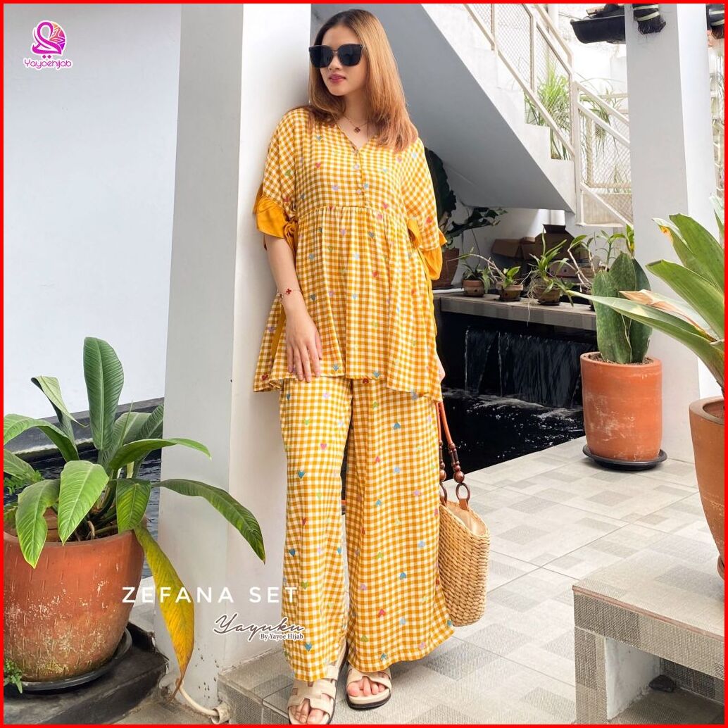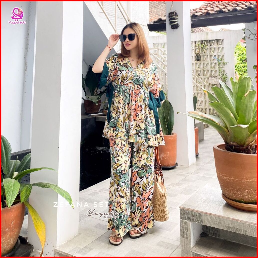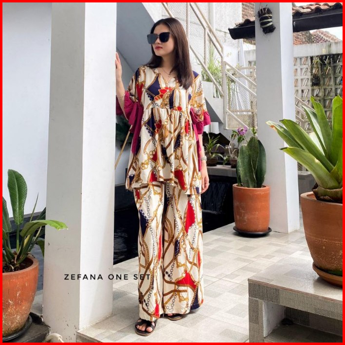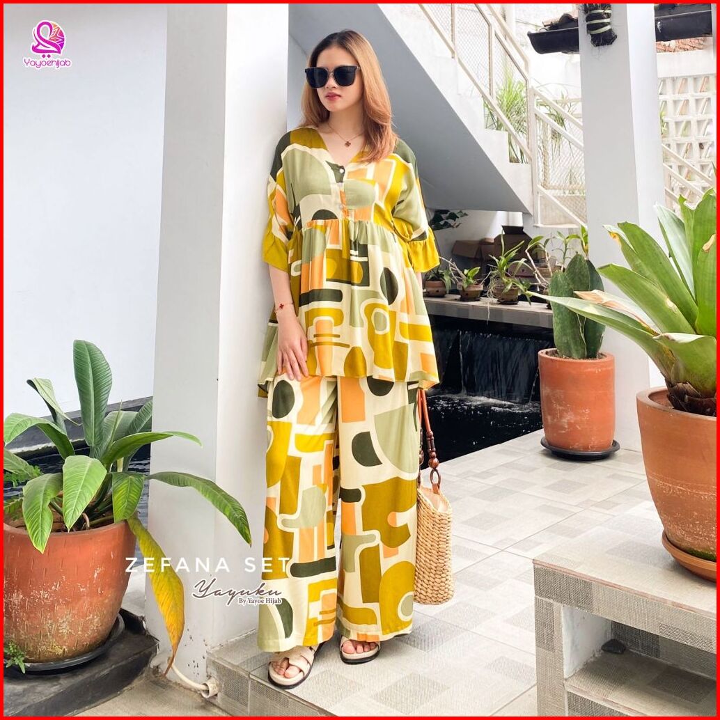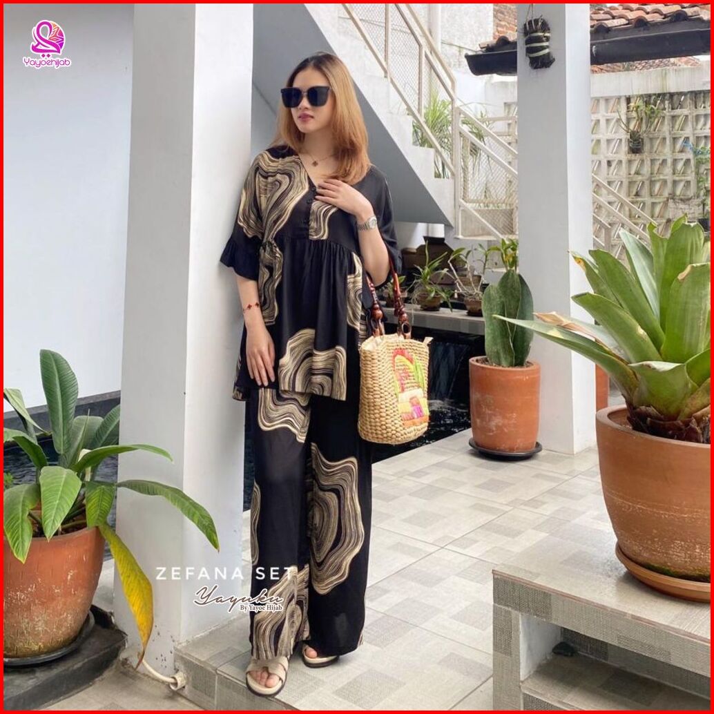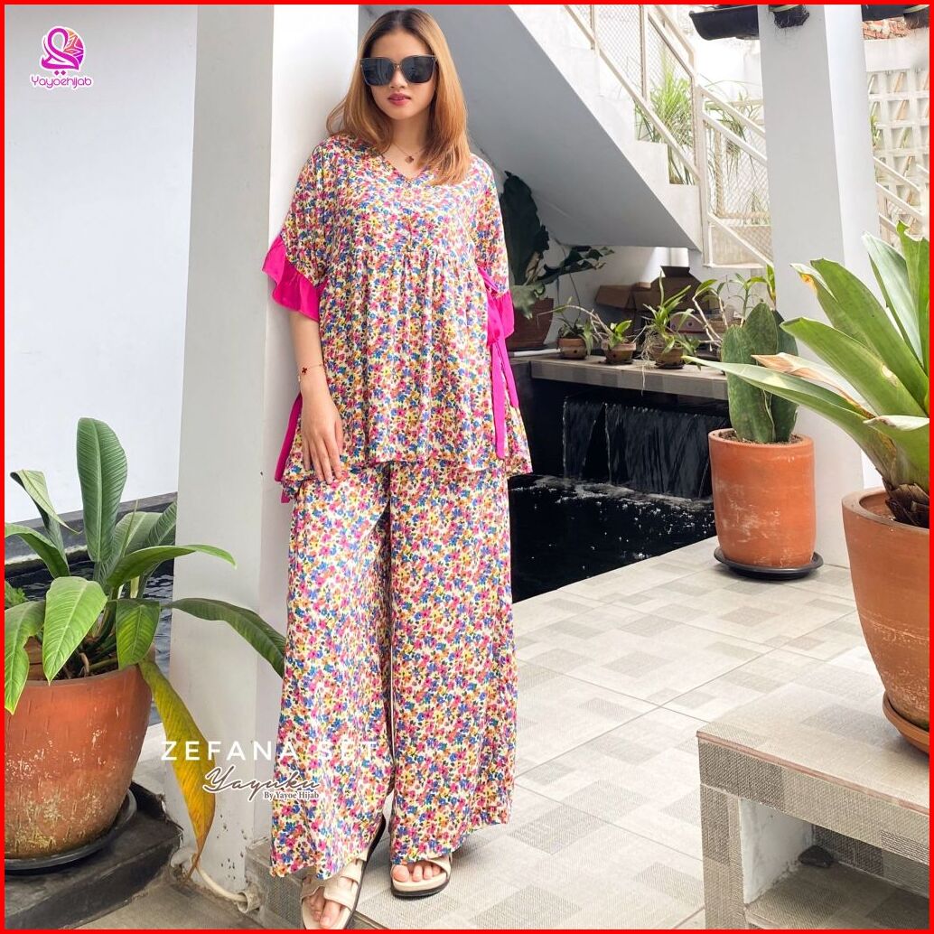 Zefana Set Celana Panjang Bahan Rayon Adem Tali Samping Kanan Kiri Kerah V-neck Busui