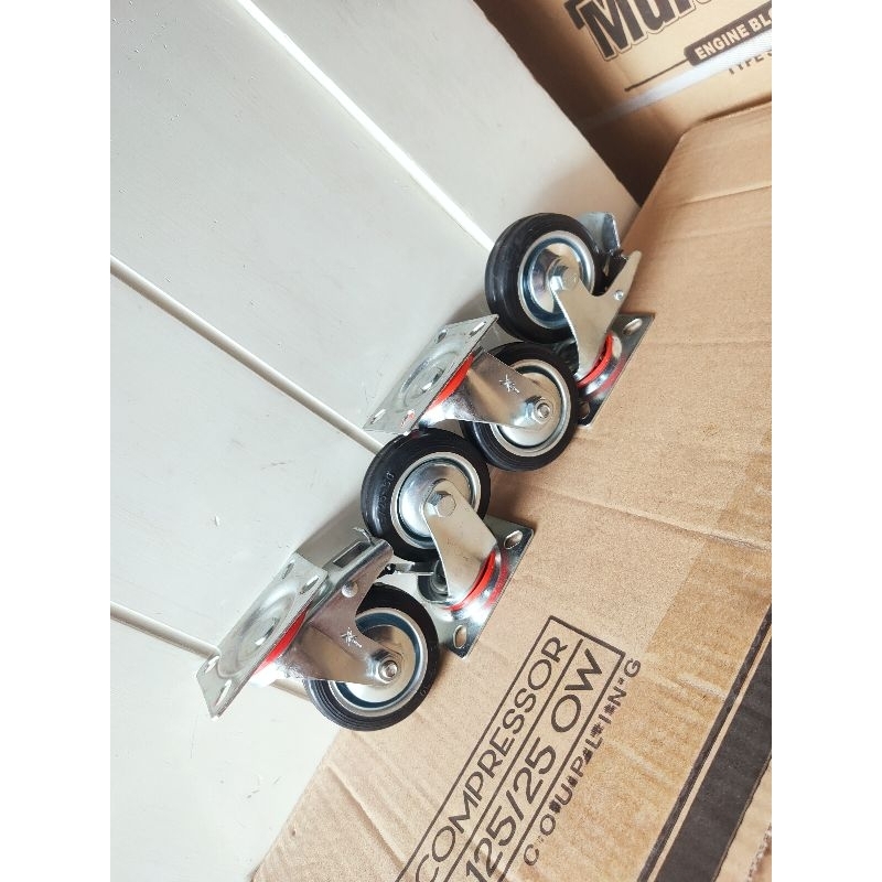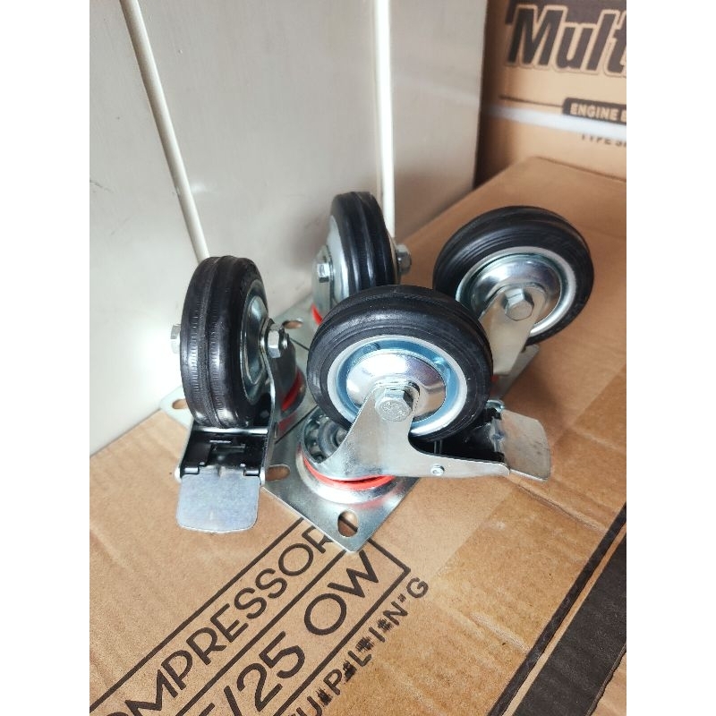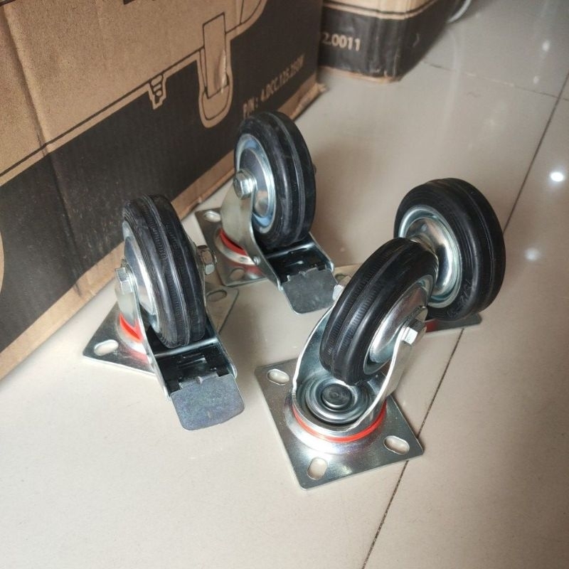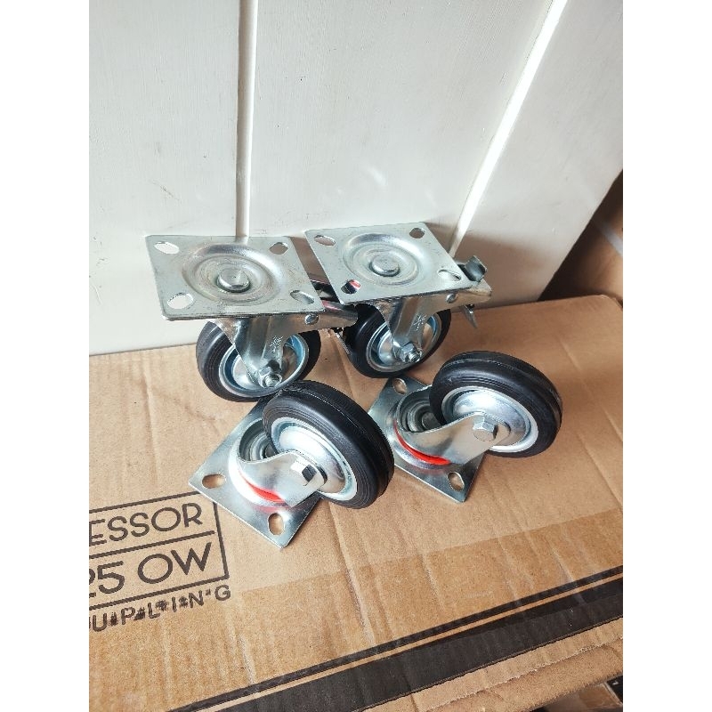 Paket Roda Gerobak Karet Hitam 3" 2 Rem 2 Hidup Roda Troli Set 4Pcs 3In Roda Grobak
