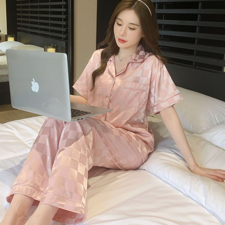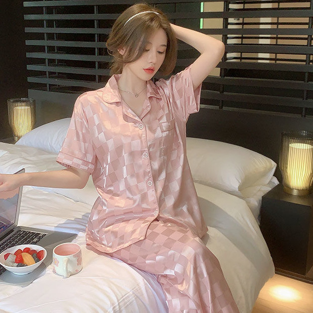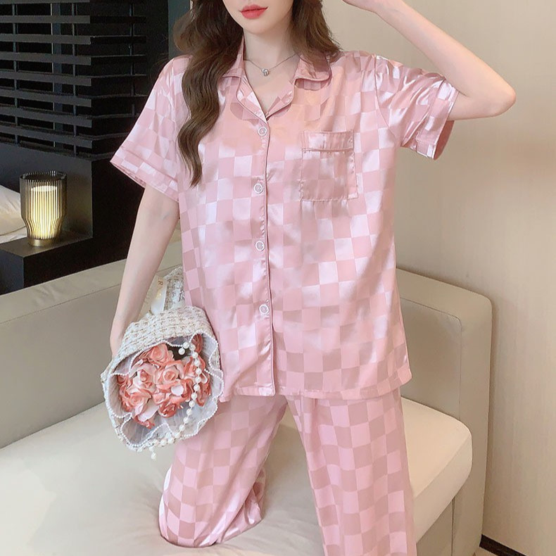MYRESELLER STELAN BAJU TIDUR IMPORT ICE SILK WANITA DEWASA MUSIM DINGIN SHORT SLEEVE KANCING KERAH MOTIF KOTAK KOTAK ELEGANT CELANA PANJANG SATIN BEST QUALITY CPLUX