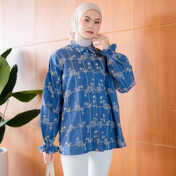 (TERLARIS)LADYORA - Alina Kemeja Denim Wanita Bordir Bunga Lengan Panjang Hijab Friendly