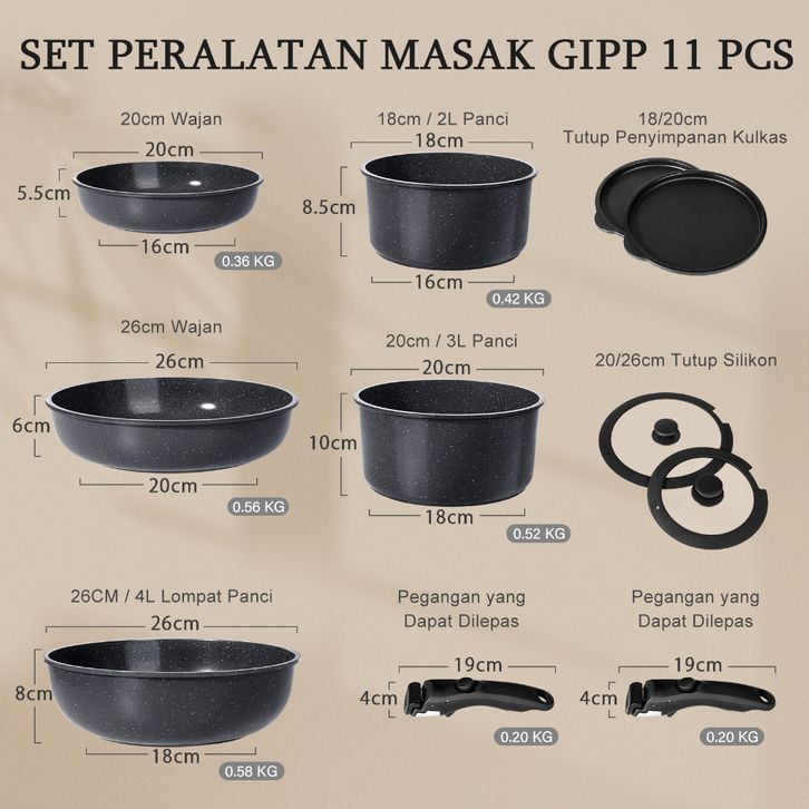 Panci Serbaguna GiPP 5/11pcs Cookware Set Anti Lengket Cocok untuk semua kompor