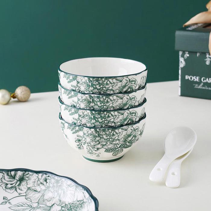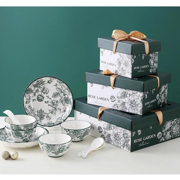 Gift Box Set Hampers Tableware Mangkok Piring Sendok Motif Green Noble Rose - Hijau