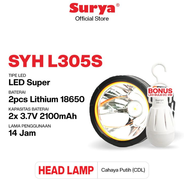 Surya Senter Cas Kepala Super Terang Headlamp Outdoor Led Waterproof Syh L305S Bonus Bohlam