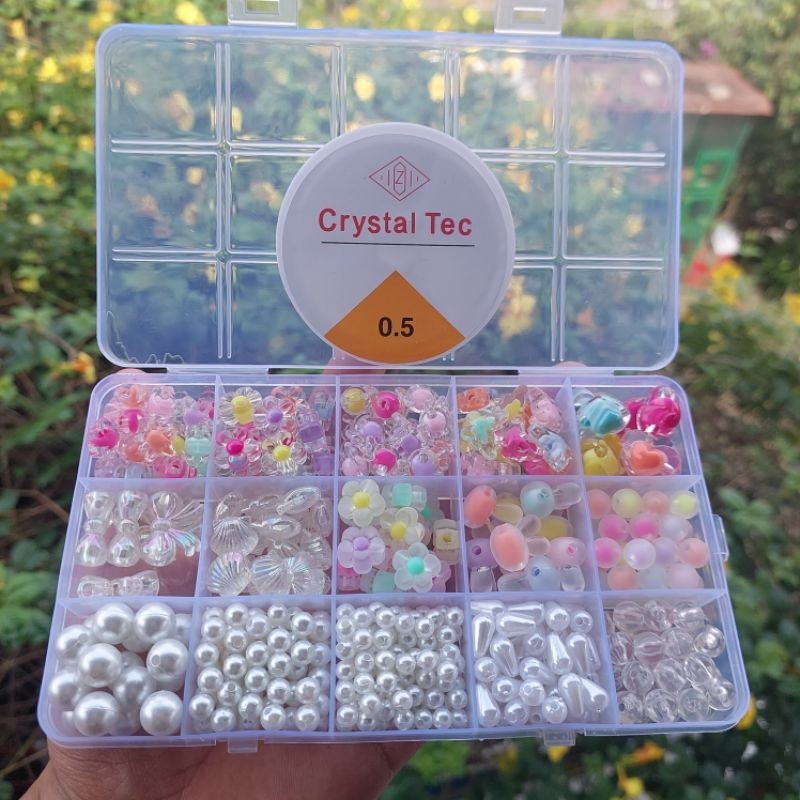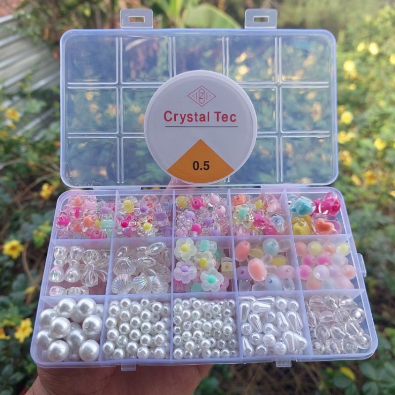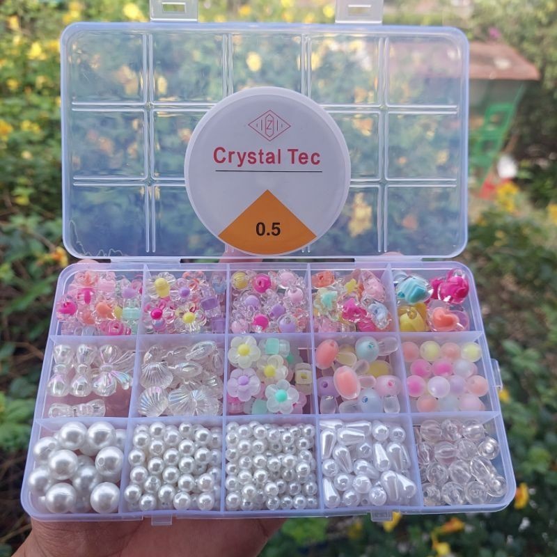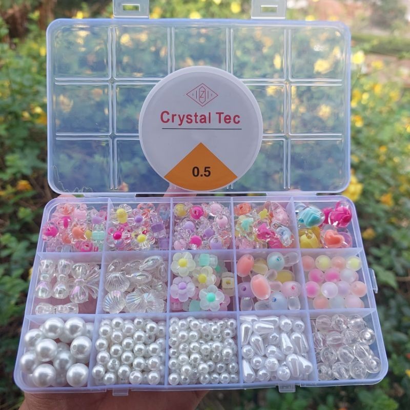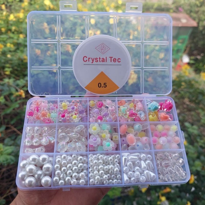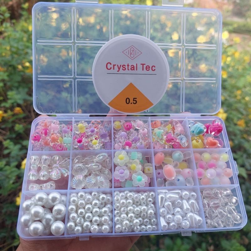 Set Mote Manik Bahan Kerajinan Anak Anak Manik Manik Bunga Isi & Manik Manik Mutiara Free Box (Free Senar Elastis) Paket