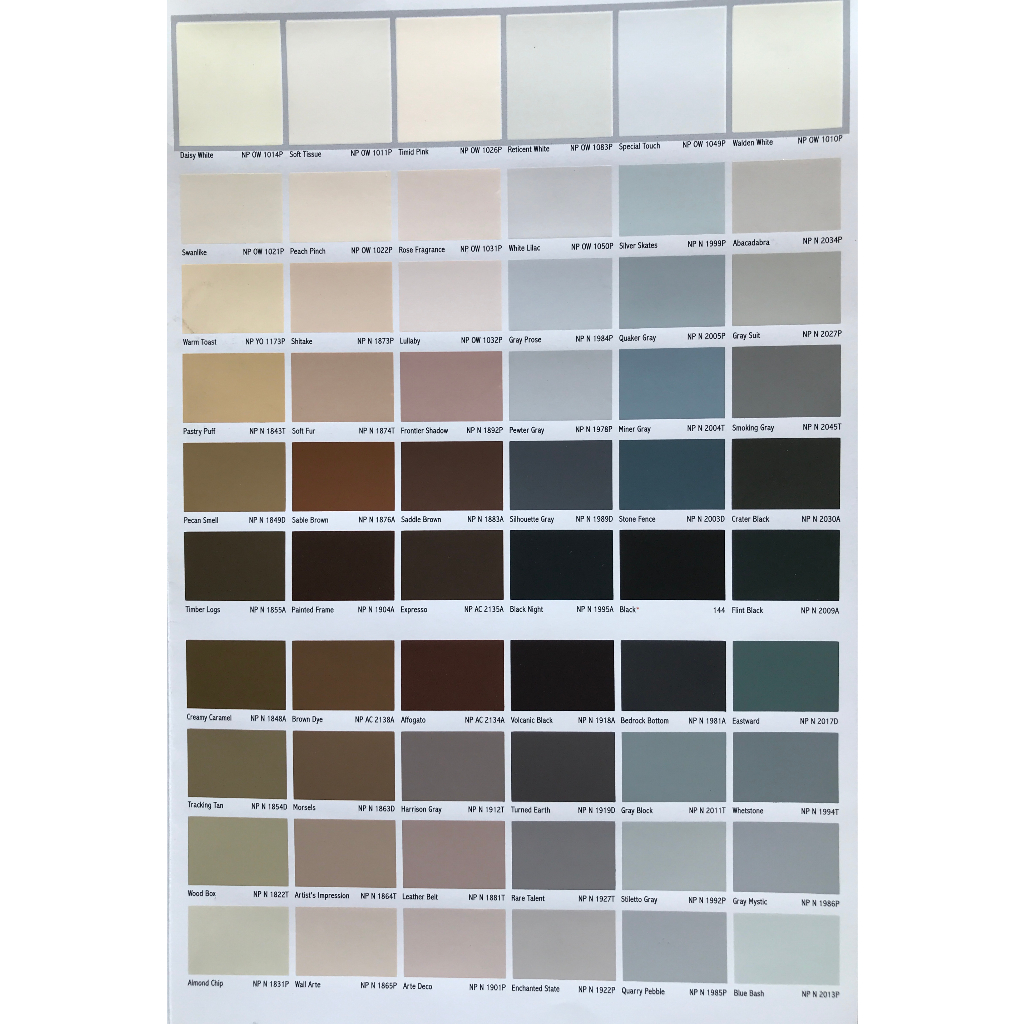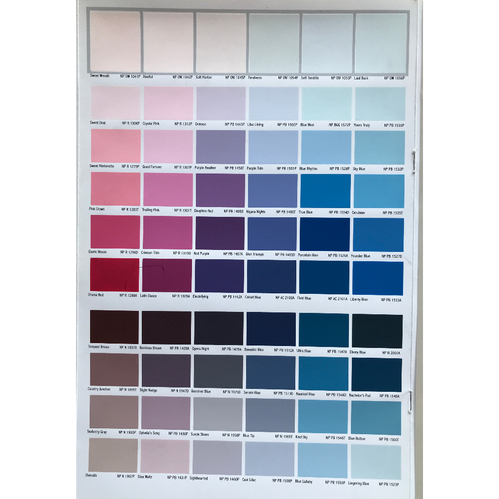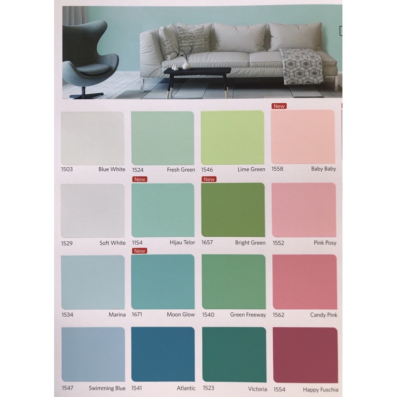 Bright Green 1657, Putih 1505, Cream 1518, Lemon 1684, Sand Storm 1560, Atlantic 1541, Hijau Telor 1154, Barley White 1515, Real Morado 1688, Chiffon 1561