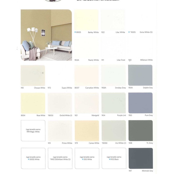 Coral Spring (942), Dream Land (943), Lily White (8006), White (300), Lady Pink (955 A), Sunlight (934), Barley White (8005), Wisdom Blue (952), Arctic Blue (937), Light Cream (926)