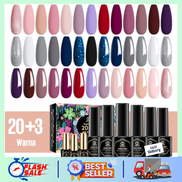 Nail Art Lengkap MEFA Set Kutek Gel 23 Pcs, 20 Warna Nail Art Putih Hitam Merah Muda Hijau Salvia Biru Navy Kilaunya