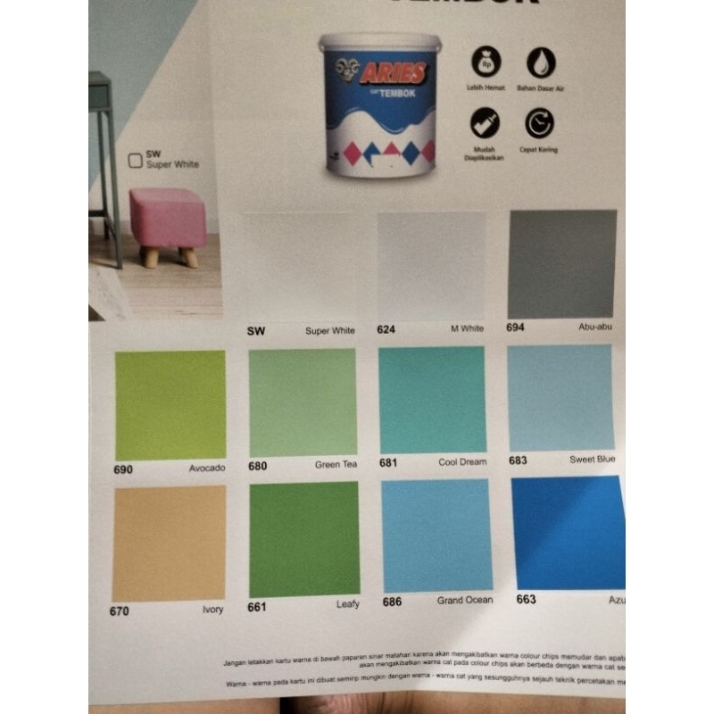 Cat tembok aries 5kg,cat aries produk Avian paint 5kg warna lengkap.UNTUK PENGIRIMAN YANG AMAN DISARANKAN ADA TAMBAHAN EKSTRA BUBBLE WRAB WAKTU PEMESANAN