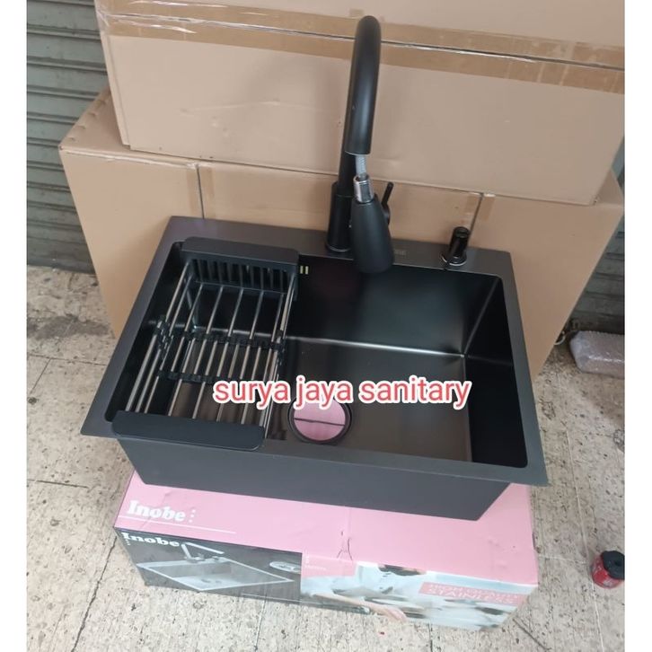 Paket kitchen sink INOBE 6045 Hitam / Kitchen sink INOBE NEW 60 x 45 paket kran tarik hitam