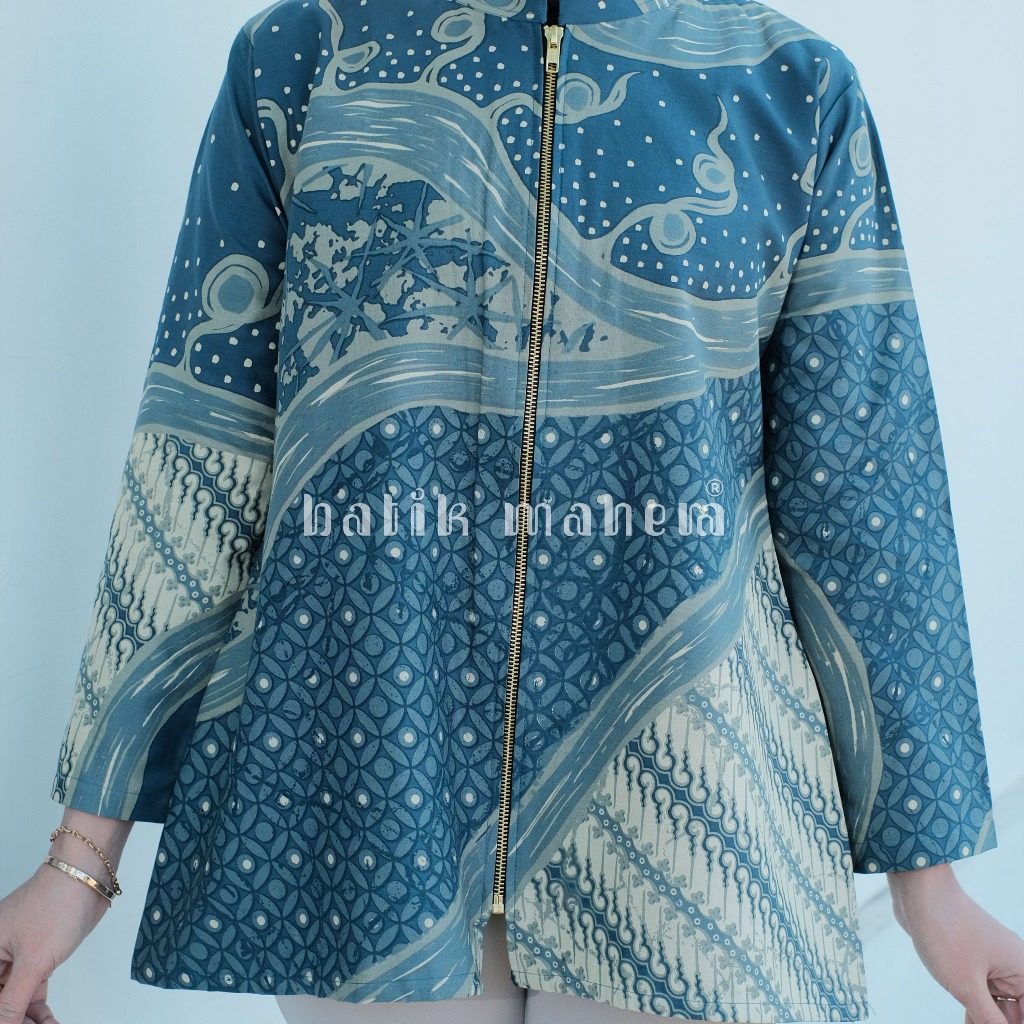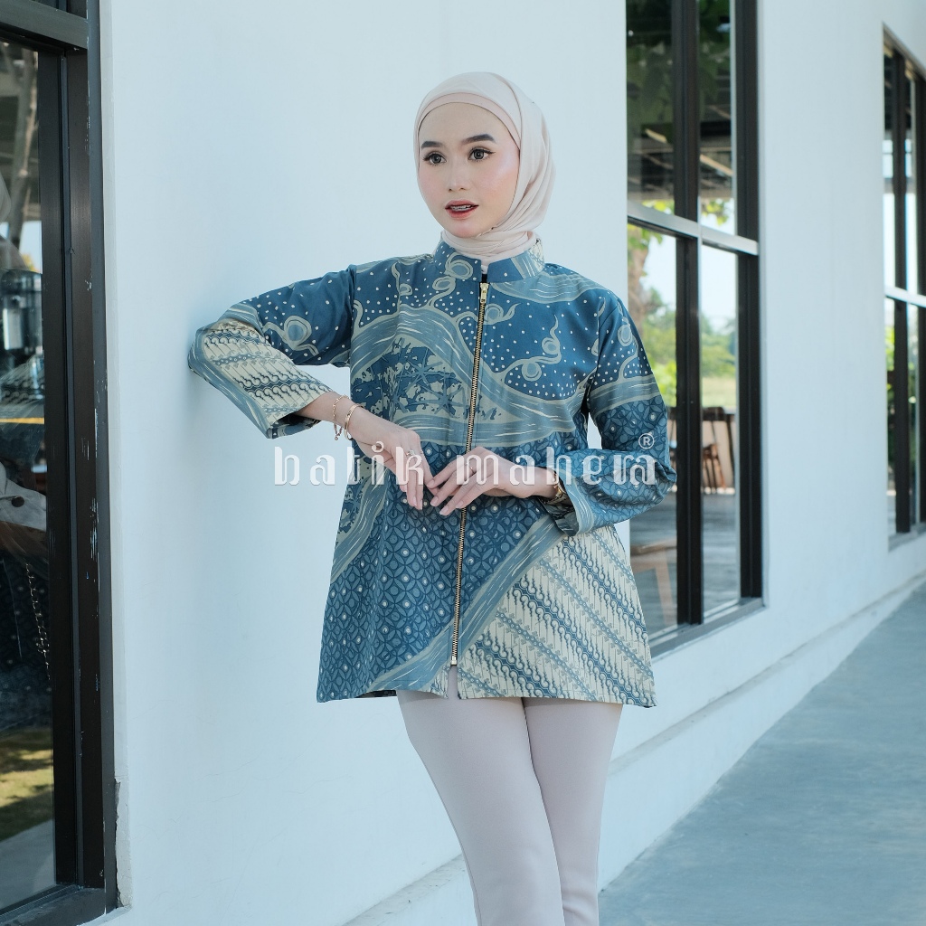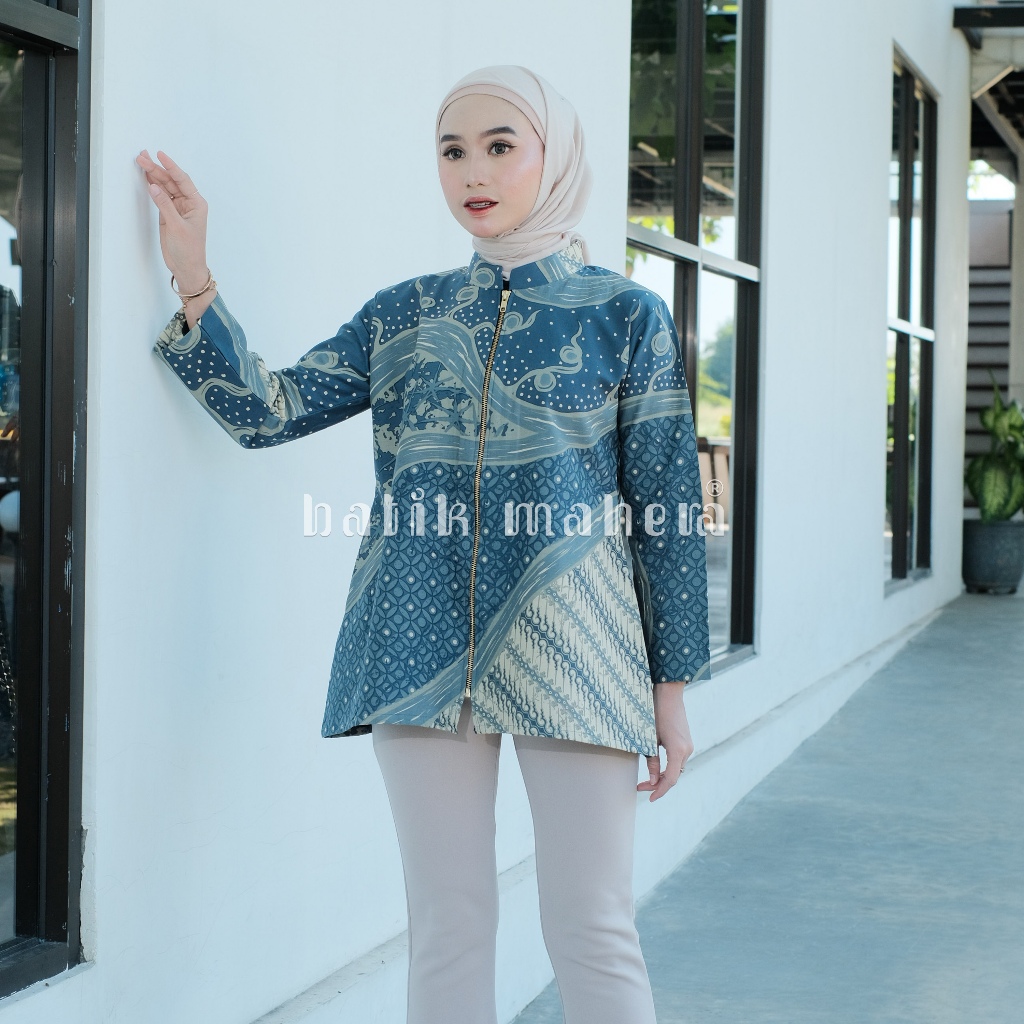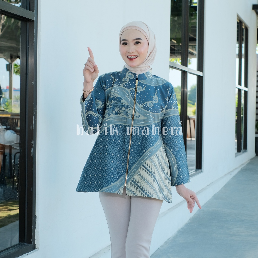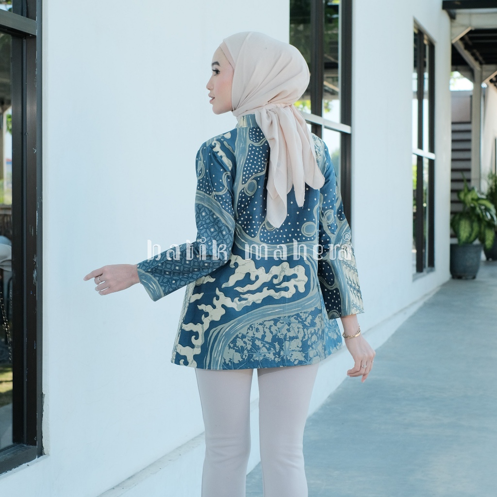 Batik Mahera Blouse Baju Batik Atasan Wanita Kerja Premium Modern Motif Lesmana Warna Abu Biru