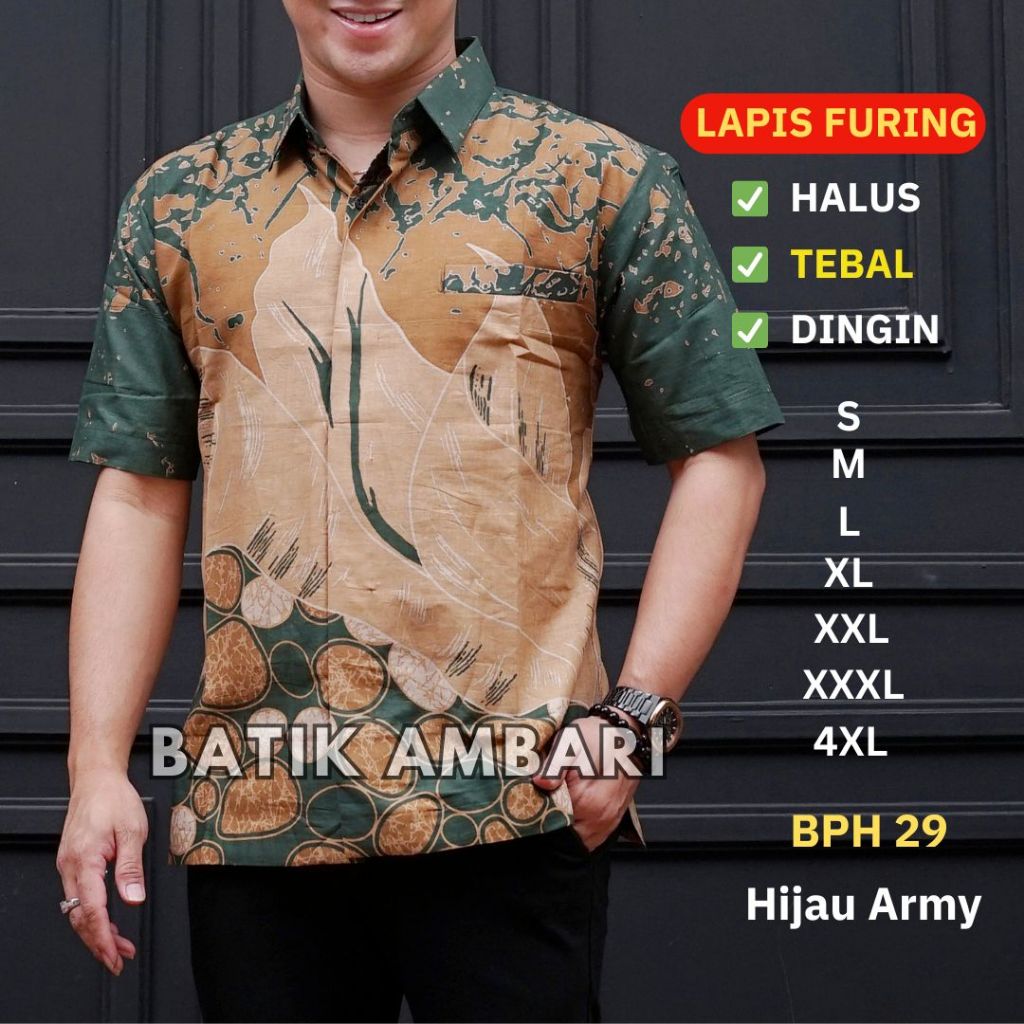 Kemeja Batik Pria Lapis FURING Lengan Pendek Standar JUMBO XXXL 4XL HIJAU ARMY Batik Ambari BPH 29