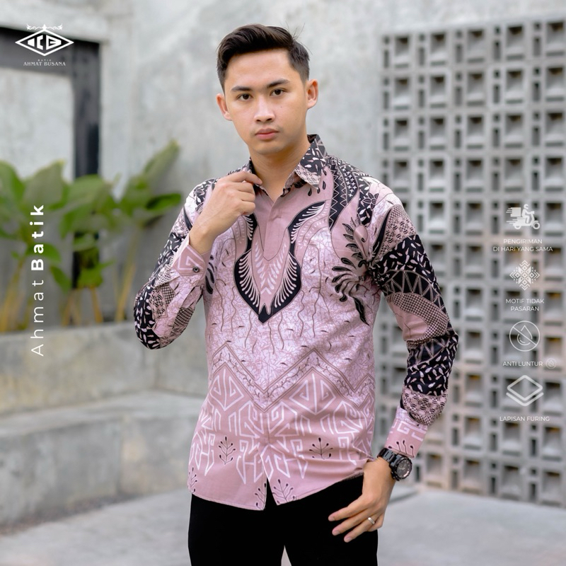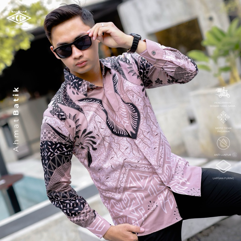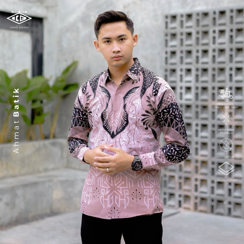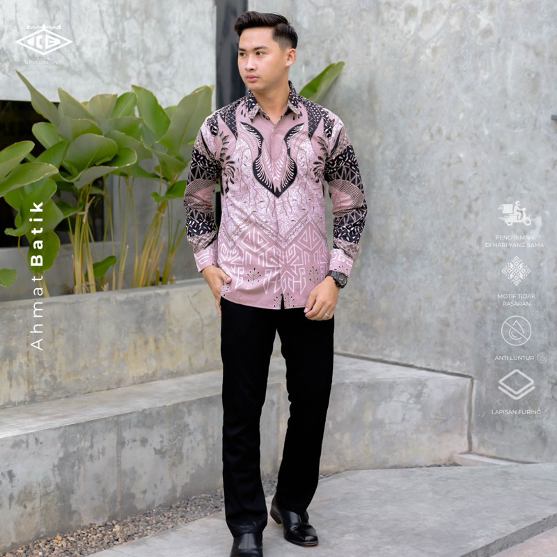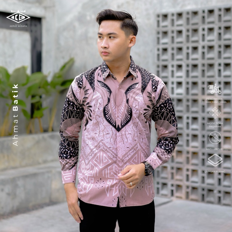 Kemeja Batik Pria Premium Motif Wasesa Soft Pink Rosegold Lengan Panjang Lapis Furing