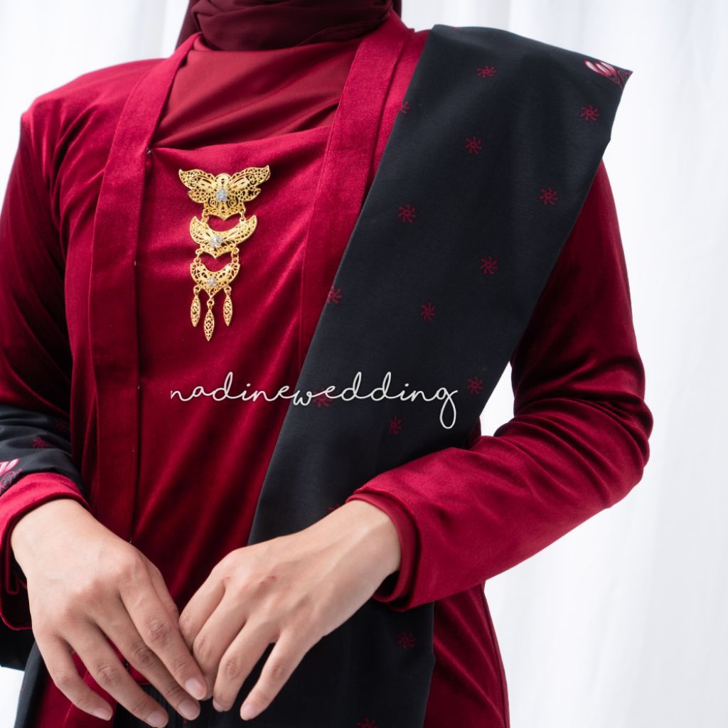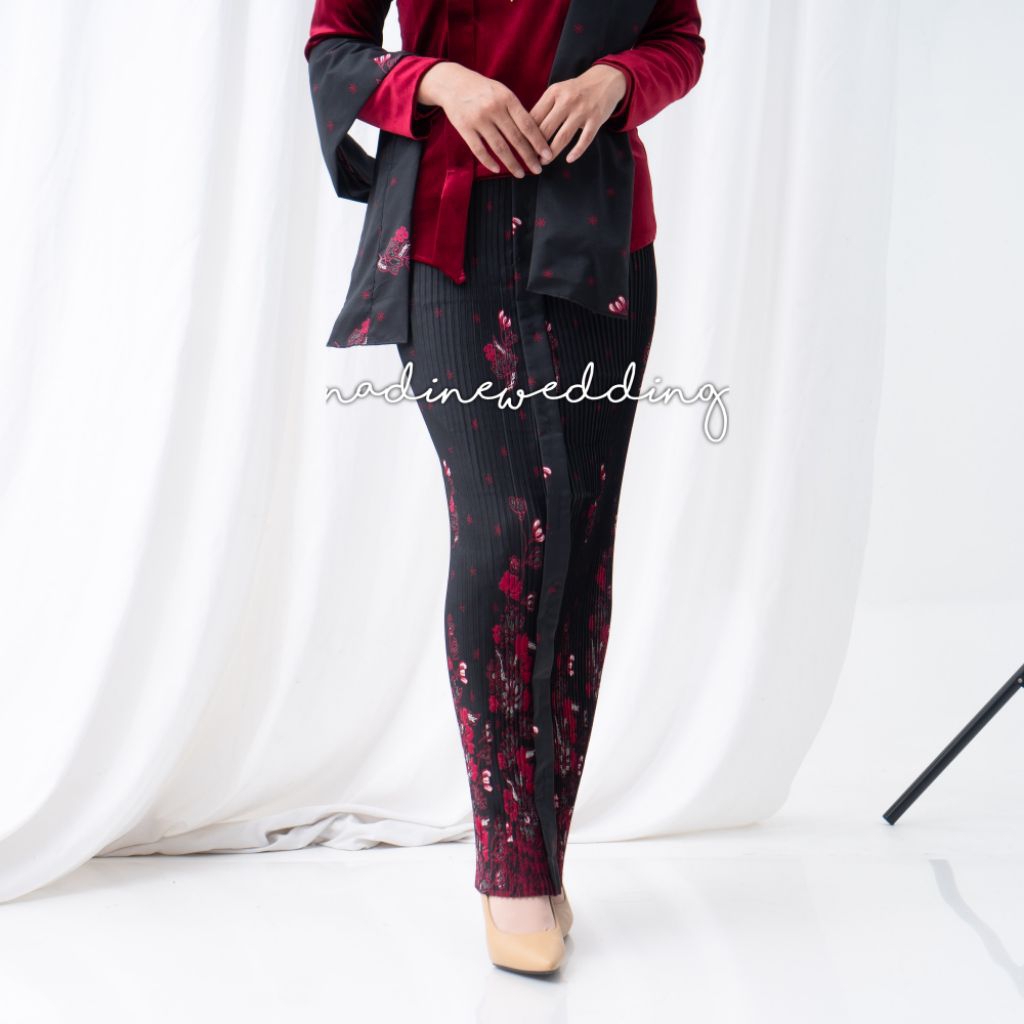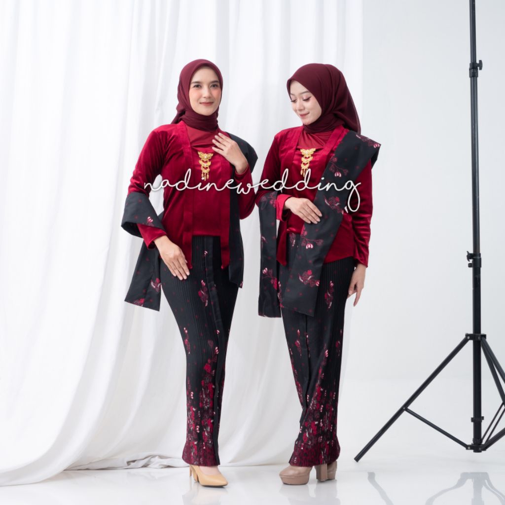 1 Set, Maroon • Kebaya Bludru Kutubaru, Rok Plisket + Selendang | Motif Mawar Merah