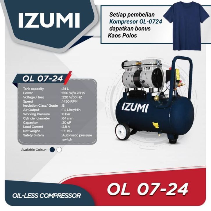 KOMPRESOR ANGIN LISTRIK 1HP 24LITER IZUMI OL1024 OILLESS SILENT KOMPRESSOR TANPA OLI JAPAN TEKNOLOGI BONUS KAOS