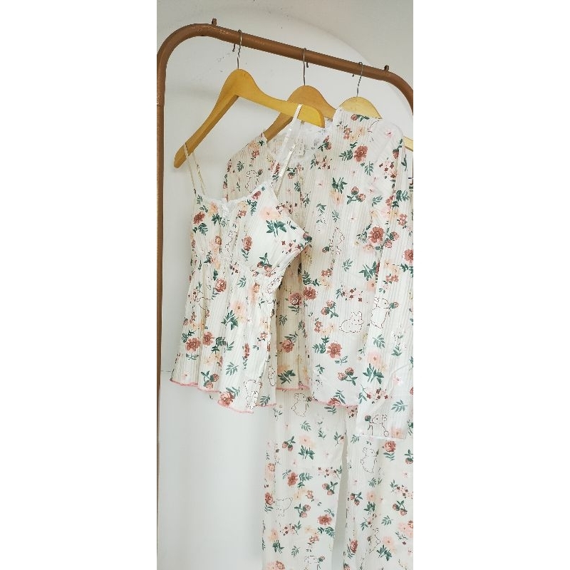 RULIF BAJU TIDUR PIYAMA WANITA IMPORT 3IN1 SETELAN KIMONO LENGAN PANJANG PREMIUM KATUN FLOWCREAM PP
