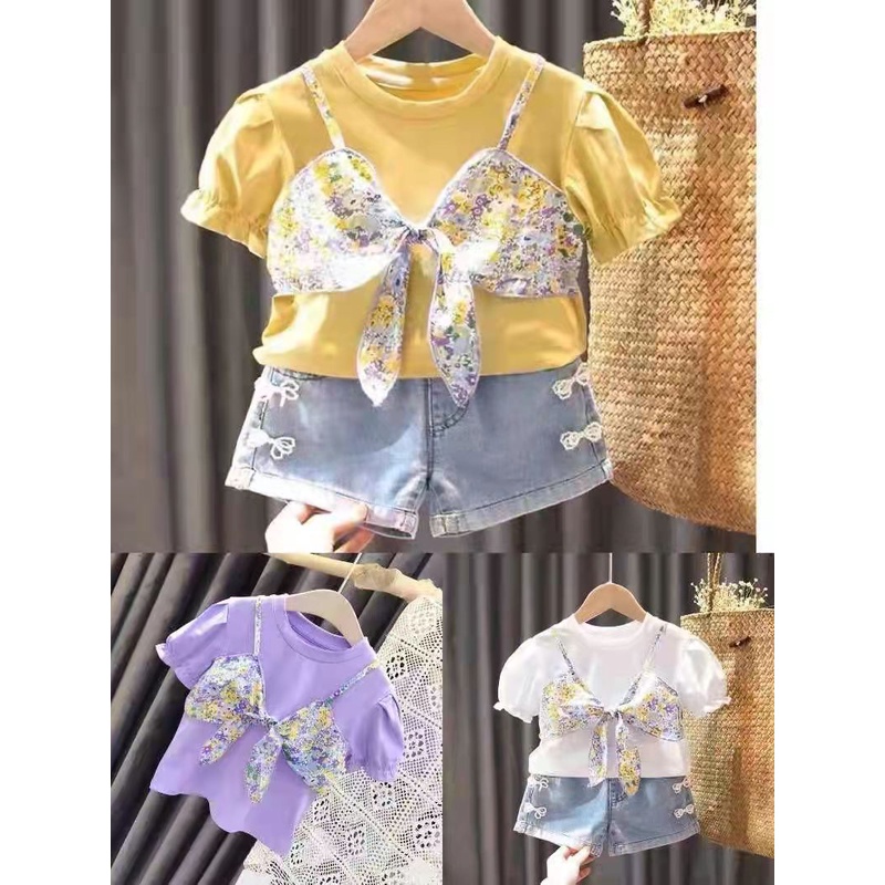 [Mall] SETELAN ANAK PEREMPUAN CELANA JEANS PENDEK+KAOS LUCU BAHAN COTTOM IMPORT UISA 9BULAN-4TAHUN