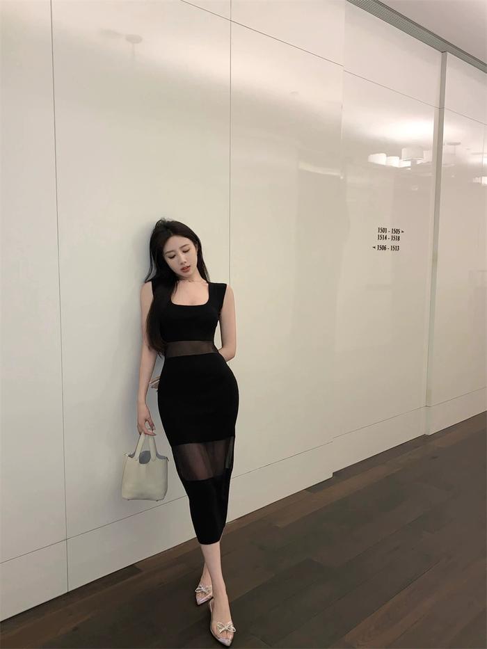 Women's Contrast Mesh Bodycon Midi Dress 1685 (S-XL)