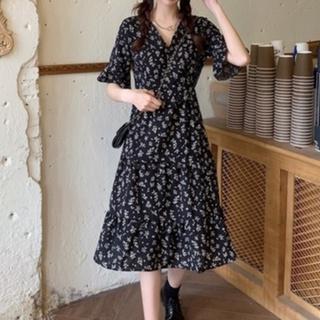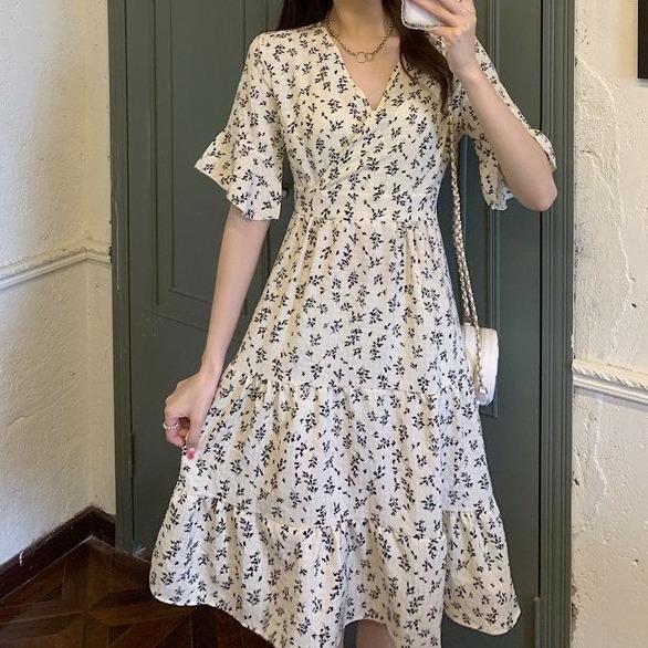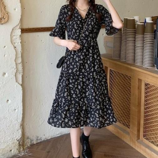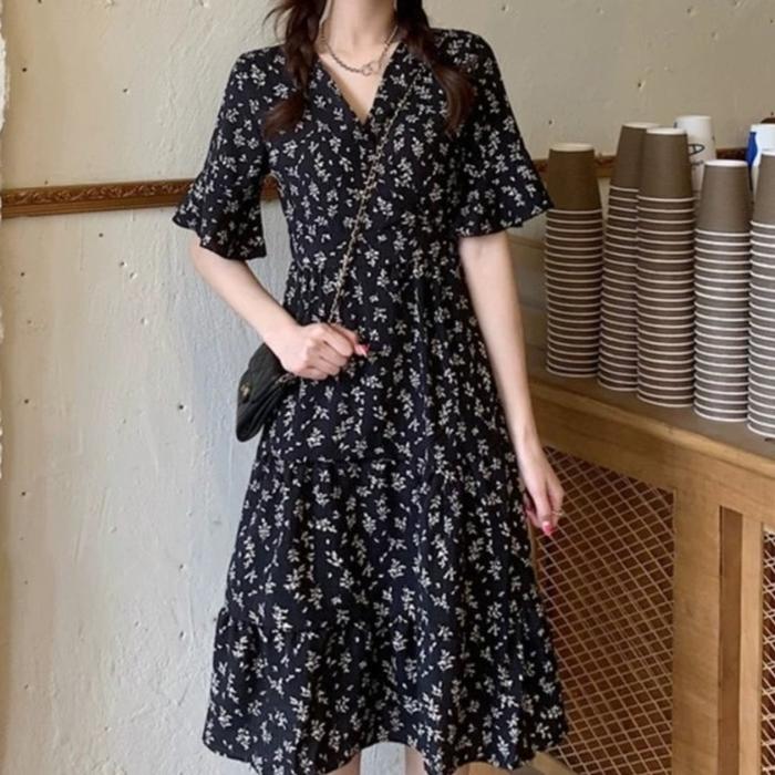 V Neck Short Sleeve A Line Floral Midi Dress 2854 (S/M/L) Baju Casual