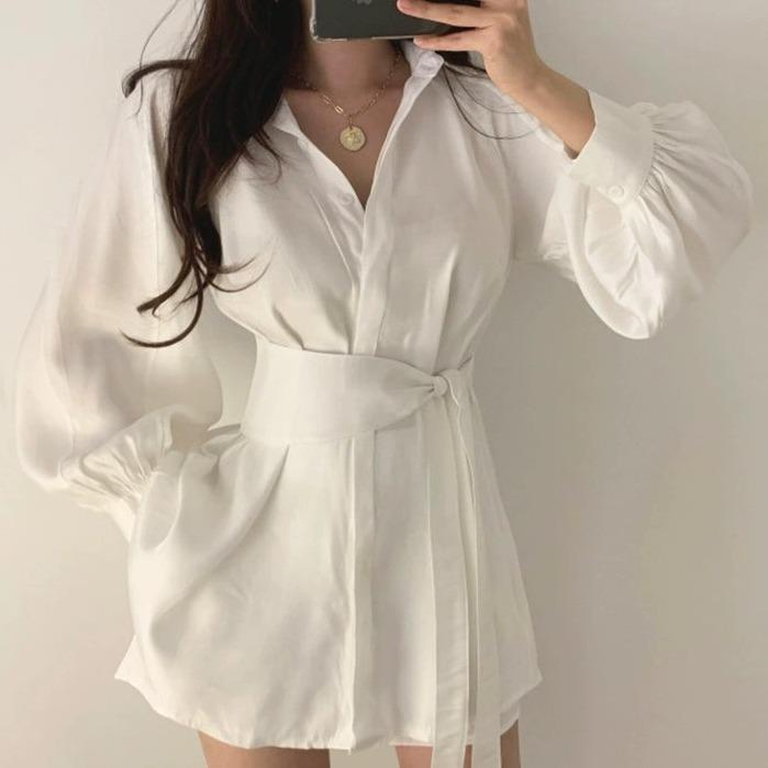 Long Puff Sleeve A Line Button Front Tie Shirt Dress 1456 (S-XL)